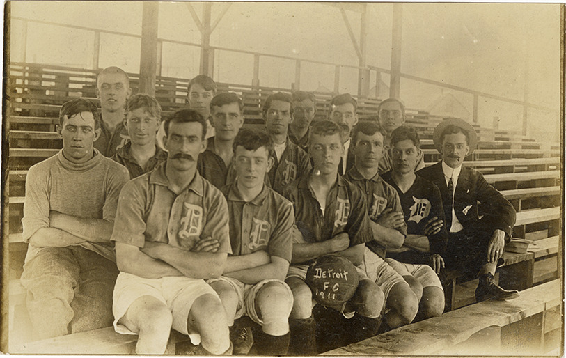 Favorite this☆ Detroit Football Club Description: View of men from the Detroit Football Club, some wearing shirts with old English "D", posing on bleachers. Printed on ball: "Detroit F.C. 1911." Details Resource ID: bh028351 Subject: Football players--Michigan--Detroit Photographic prints Postcards Date Issued: 1911 Format: 1 postcard ; 3.5 x 5.5 in. Member of: Burton Historical Collection Clarence Faber Collection Filing Location: D/Football Rights: Physical rights are retained by DPL. Copyright is retained in accordance with U.S. copyright laws.