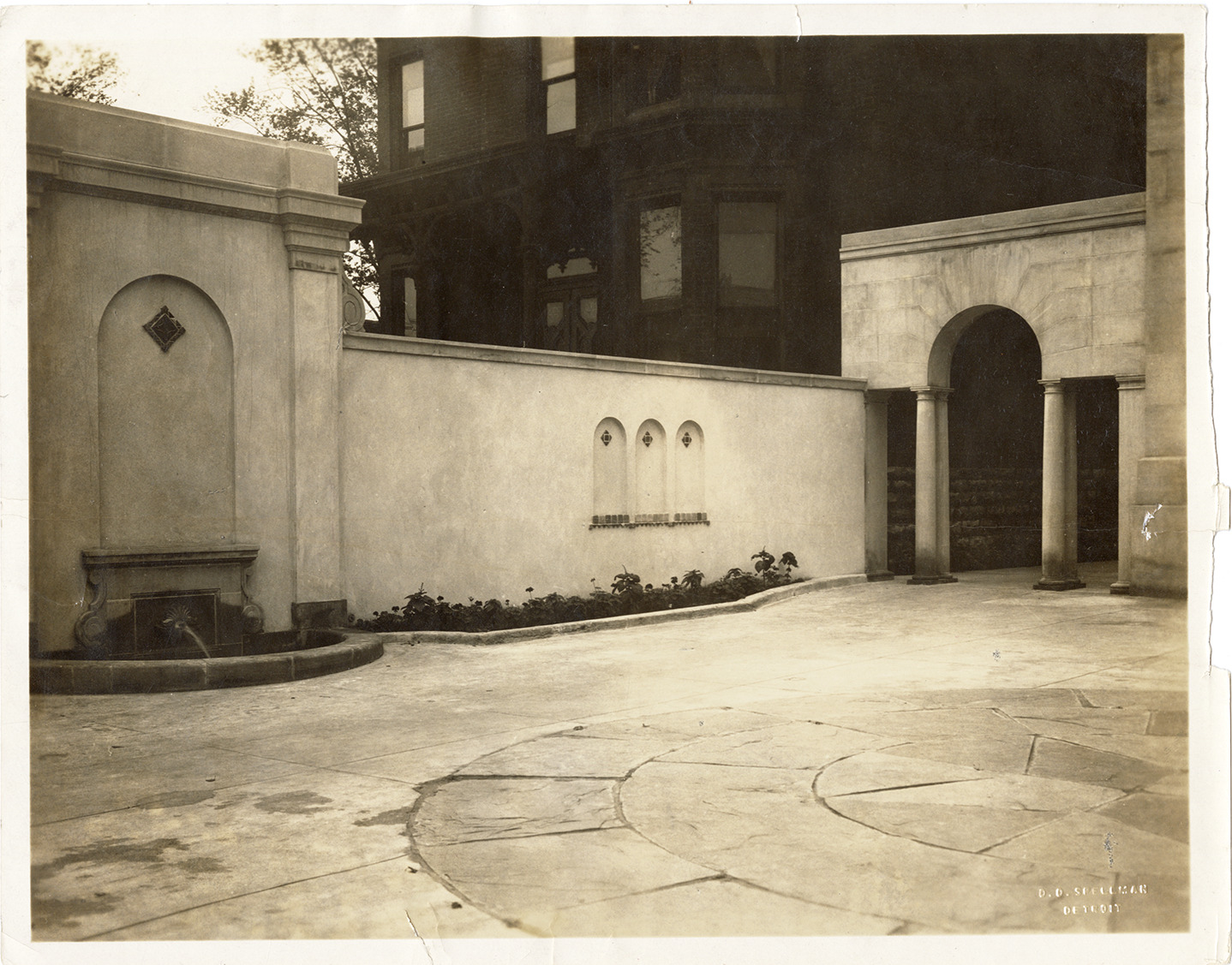View of the fountain and north wall of the Bonstelle Theatre. Arch supported by columns in background. Embossed on front: "D.D. Spellman, Detroit." Label on back: "The completed north wall and fountain at the Bonstelle Playhouse which rounds out the unusual architecture of the institution. Designed by C. Howard Crane, tiled by the Pewabic potters and executed by Hugh Loughton."