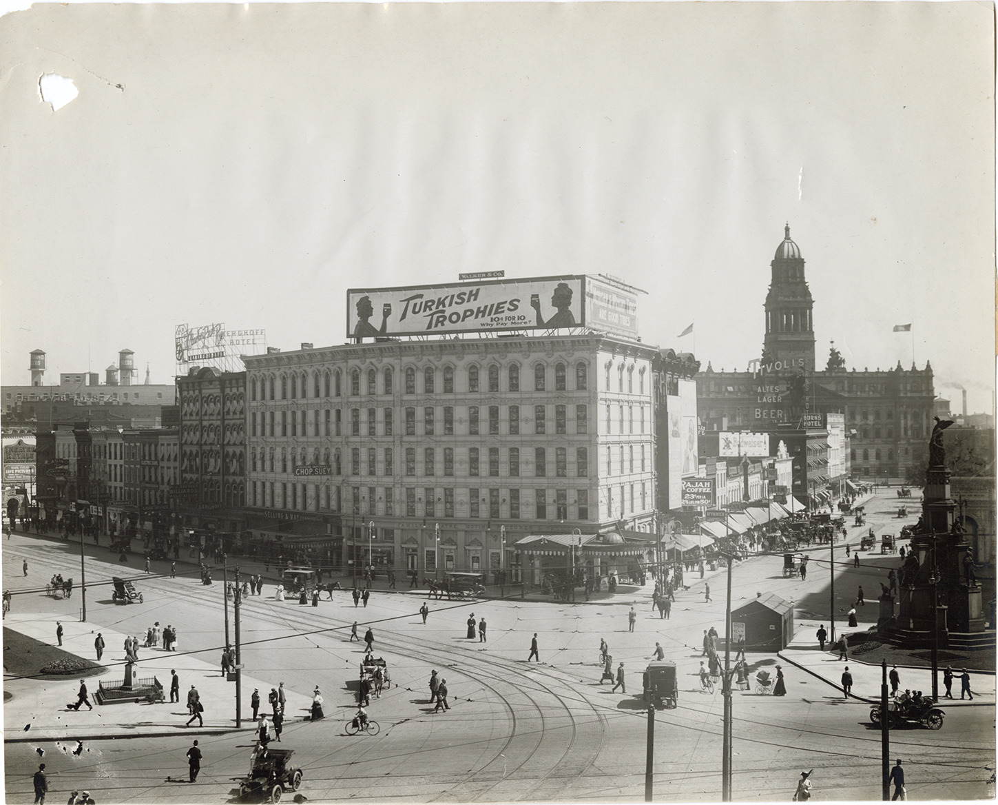 View along Cadillac Square of the Family Theatre, with Wayne County building in background. Soldiers' and Sailors' Monument on far right. Cars; horse-drawn carriages and wagons; multiple pedestrians. Signs include Tivoli's Altes lager beer, Burns Hotel, Chinese Imperial Chop Suey, Sterling & May and Marx's Market. Walker & Co. billboard for Turkish Trophies.