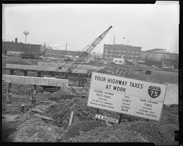 View of the Chrysler I-75 Expressway during construction. Sign in foreground reads [in part]: "Your highway taxes at work, Interstate Michigan 75. L.A. Davidson." Crane in background. Handwritten on sleeve: "Dec. 10, 1965."
