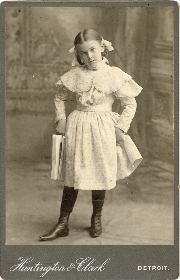 Portrait of Juliette Irene Finn as a young girl. Printed on front: "Huntington & Clark, Detroit." Printed on back: "Huntington & Clark, successors to Millard, 224 Woodward Ave., Detroit, Mich. Negative retained for future orders. Duplicates at any time at reduced rates. We have the 70,000 negatives made by Powelson and Millard." Handwritten on back: "Juliette Irene Finn. Born Port Huron, Mich. March 9, 1889."