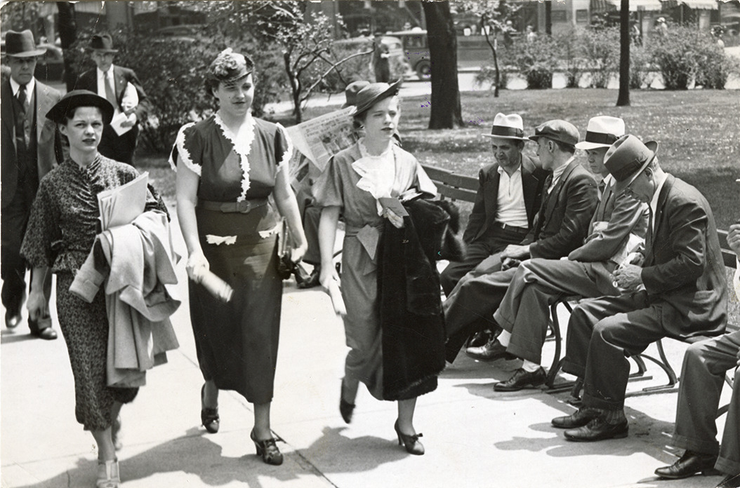 View of three woman walking past a group of men sitting on a park bench in Grand Circus Park. Handwritten on back: "Grand Circus Park." Stamped on back: "May 11 1936."