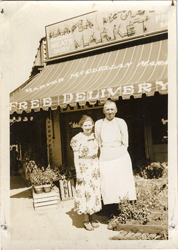 View of a man and woman posing in front of the Harper McClellan Market. "Harper McClellan Market, free delivery" is lettered on striped awning. Flats of plants in foreground. Neon sign is displayed over awning. Handwritten on back: "Harper McClellan Market, Detroit."