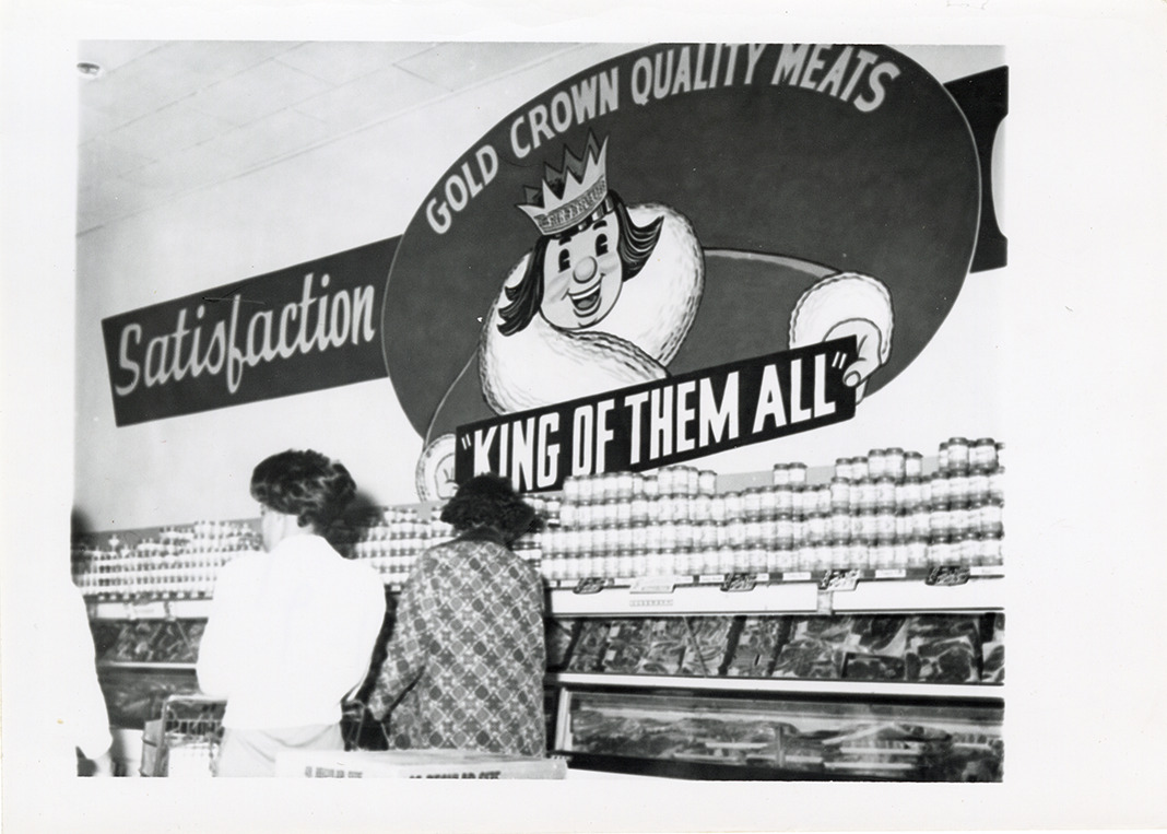 View of two women shopping at the King Cole supermarket, located at 2441 Puritan. Canned goods are stacked over meat cooler. Sign depicting a king reads: "Satisfaction, Gold Crown quality meats. King of them all." Handwritten on back: "2441 Puritan, circa 1963."