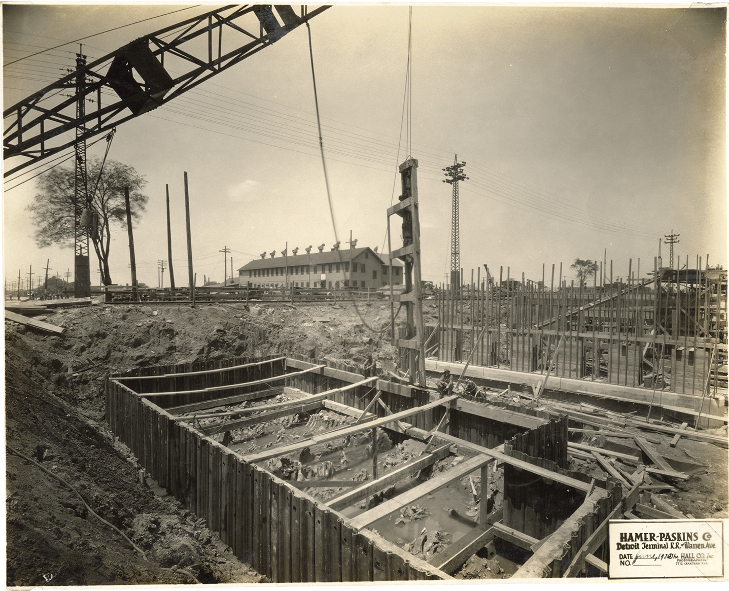 View of workers constructing the Detroit Terminal railroad bridge at Warren Ave. in Dearborn, Michigan. Printed on front: "Hamer-Paskins Co., Detroit Terminal R.R. at Warren Ave. Date: June, 1930. The Hall Co., Inc., photographers, 5536 Cranshaw Ave."