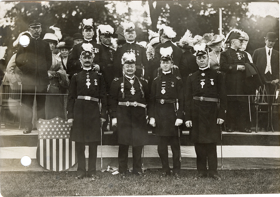 View of William B. Mellish, George T. Campbell and two Detroit commanders posing in front of dais on Belle Isle during the 1912 Knights Templar convention. Handwritten on back: "Wm. B. Mellish, Cincinnati, Geo. T. Campbell, Owosso (in centre). Two Detroit commanders on side."