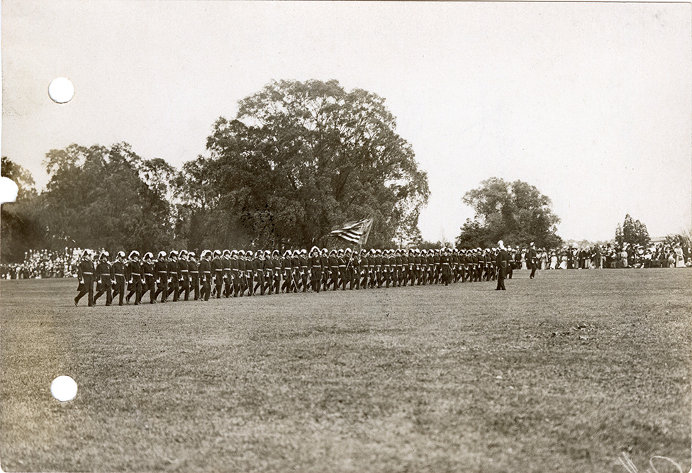 View of the Damascus commandery #42 marching in formation on Belle Isle during the 1912 Knights Templar convention. Handwritten on back: "Damascus commandery #42 at Belle Isle."