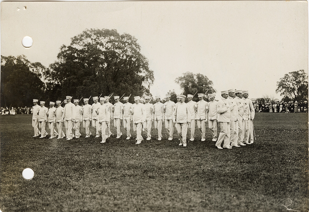View of the Englewood commandery marching in formation on Belle Isle during the 1912 Knights Templar convention. Handwritten on back: "Knights Templar convention, June 1912."