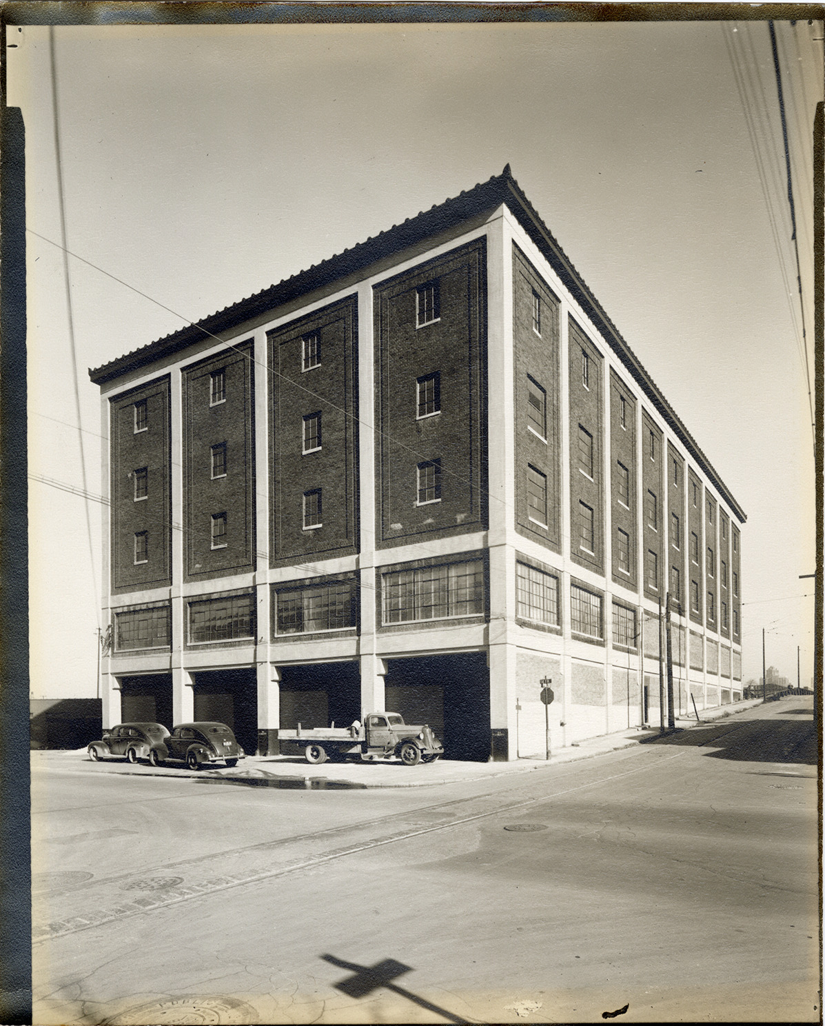 View of the R.A. Epsteine warehouse, located at the corner of Porter Street and 14th Street. Cars and truck are parked next to building. Lettered on side of truck: "The W.W. White Company, mason contractors." Handwritten on back [information transcribed from original mat board]: R.A. Epsteine warehouse, after." Handwritten on back: "14th & Porter."