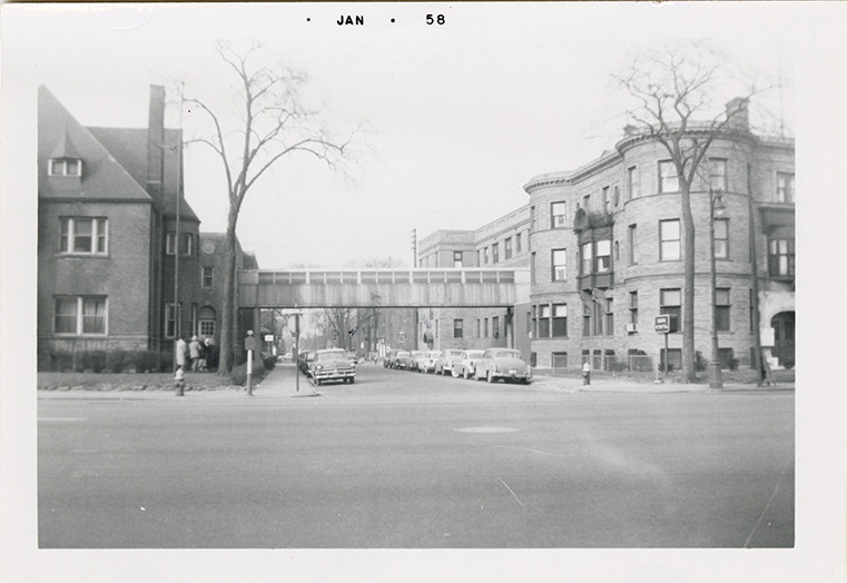 View of an elevated walkway for Alexander Blain Hospital over Dubois St., taken from East Jefferson Avenue. Cars in street. Printed on front: "Jan 58." Handwritten on back: "Alexander Blain Hospital, over Dubois St. Taken from Jefferson."