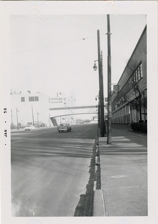 View of an elevated walkway for the Plymouth Division, Chrysler Corporation over E. Jefferson Ave. Cars in street. Printed on front: "Jan 58." Handwritten on back: "Chrysler Plymouth over East Jefferson."