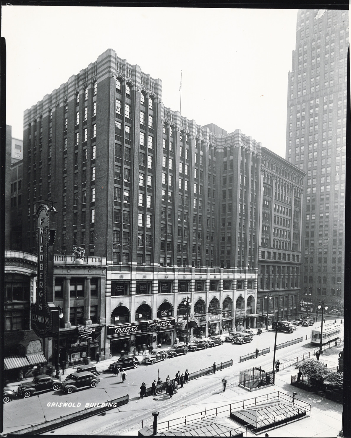 View of the Griswold building, located at 1214-1230 Griswold Street and designed by Albert Kahn. Businesses on street level include Friedberg's Diamonds, Peter's sport equipment, Ray's and Zinkes. Automobiles parked in street. Printed on front: "Griswold building, 10-1-40."