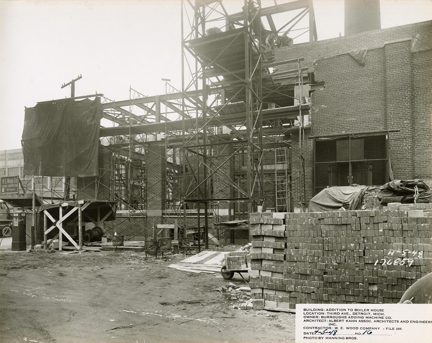 View of scaffolding on addition to Burroughs Adding Machine Company factory boiler house during construction. Pile of bricks in foreground. Printed on front: "4-5-48. 176859. Building: Addition to boiler house. Location: Third Ave., Detroit, Mich. Owner: Burroughs Adding Machine Co. Architect: Albert Kahn Assoc. Architects and Engineers, Inc. Contractor: W.E. Wood Company, file 286. Date: 4-5-48. No. 16. Photo by Manning Bros."