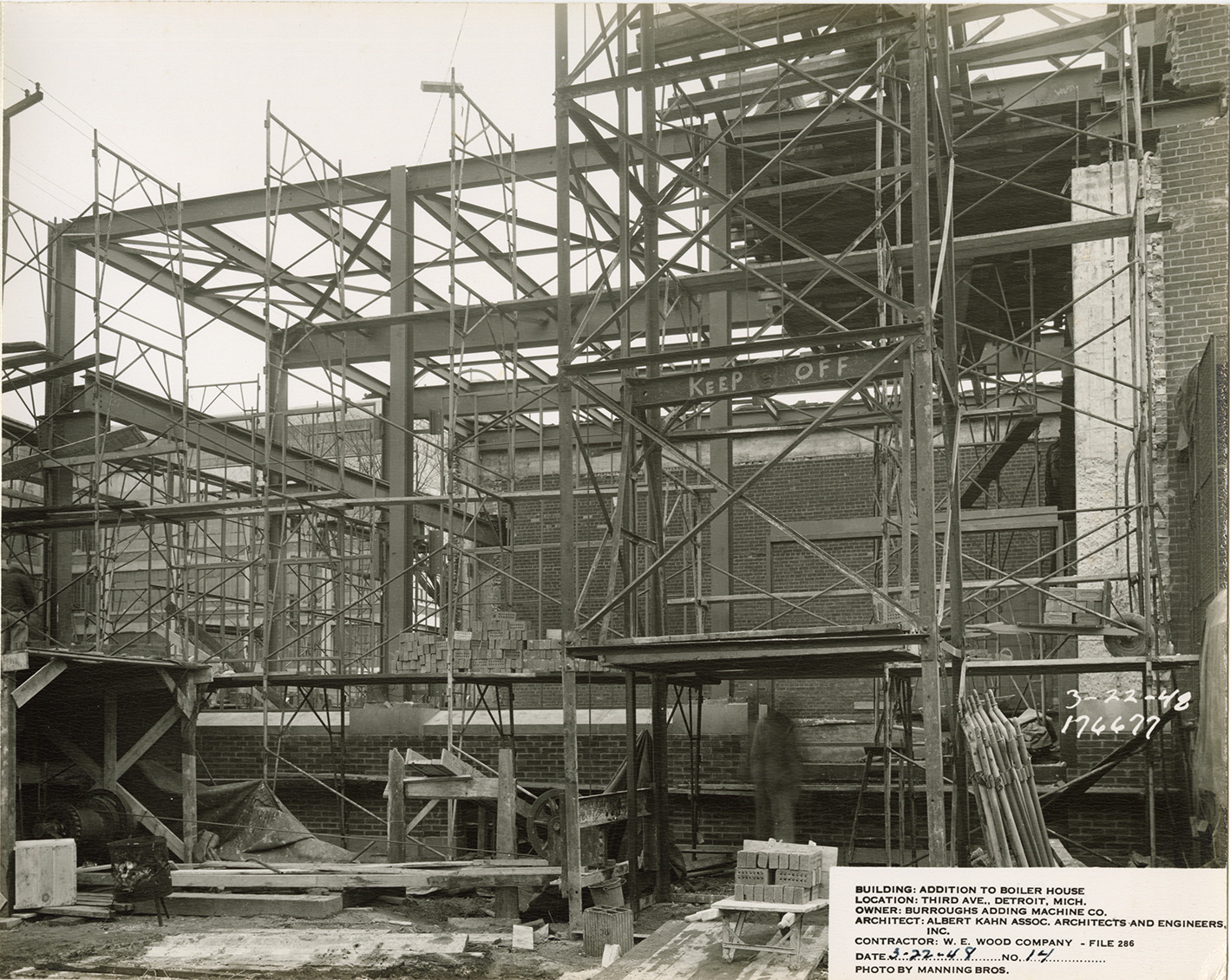 View of scaffolding on addition to Burroughs Adding Machine Company factory boiler house during construction. Printed on front: "3-22-48. 176677. Building: Addition to boiler house. Location: Third Ave., Detroit, Mich. Owner: Burroughs Adding Machine Co. Architect: Albert Kahn Assoc. Architects and Engineers, Inc. Contractor: W.E. Wood Company, file 286. Date: 3-22-48. No. 14. Photo by Manning Bros."