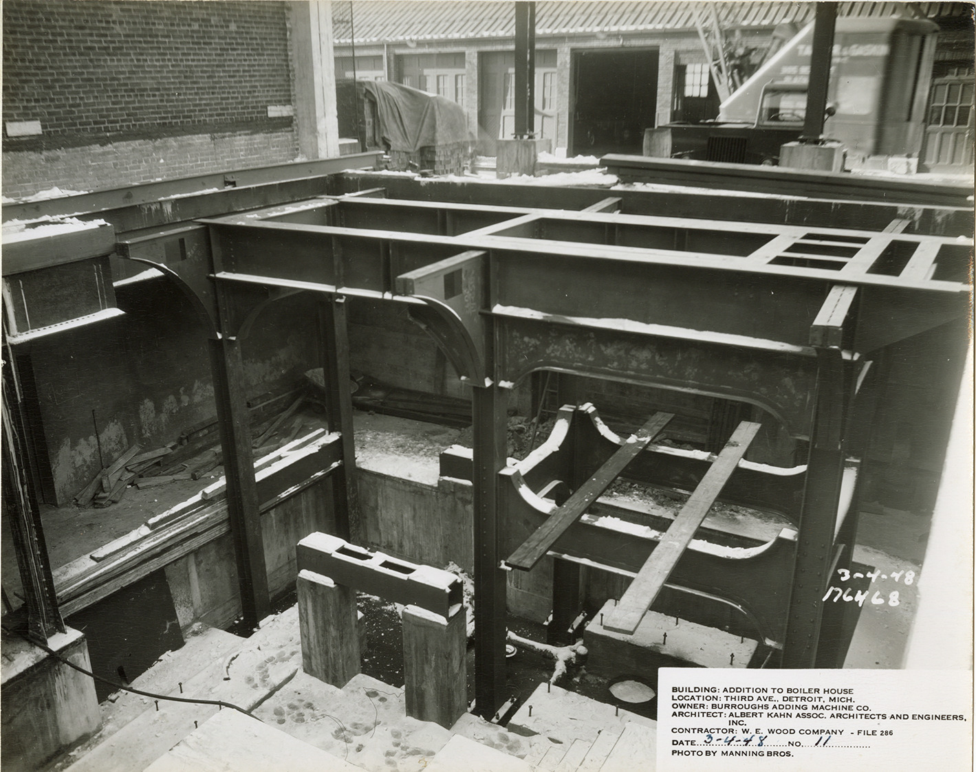 View of the addition to Burroughs Adding Machine Company factory boiler house during construction, with snow on beams. Printed on front: "3-4-48. 176468. Building: Addition to boiler house. Location: Third Ave., Detroit, Mich. Owner: Burroughs Adding Machine Co. Architect: Albert Kahn Assoc. Architects and Engineers, Inc. Contractor: W.E. Wood Company, file 286. Date: 3-4-48. No. 11. Photo by Manning Bros."