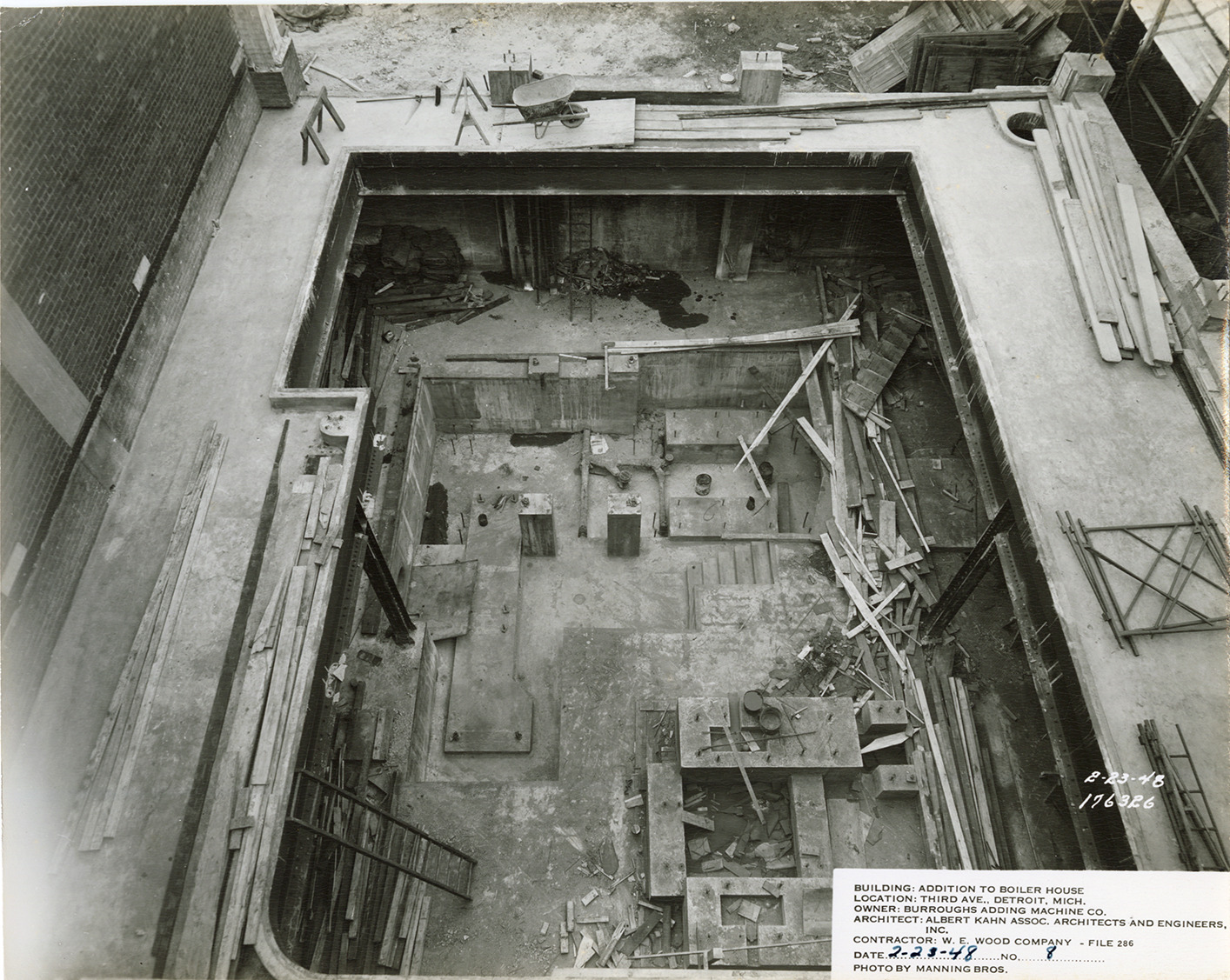 Bird's-eye view of the addition to Burroughs Adding Machine Company factory boiler house during construction, showing interior. Printed on front: "2-23-48. 176326. Building: Addition to boiler house. Location: Third Ave., Detroit, Mich. Owner: Burroughs Adding Machine Co. Architect: Albert Kahn Assoc. Architects and Engineers, Inc. Contractor: W.E. Wood Company, file 286. Date: 2-23-48. No. 8. Photo by Manning Bros."