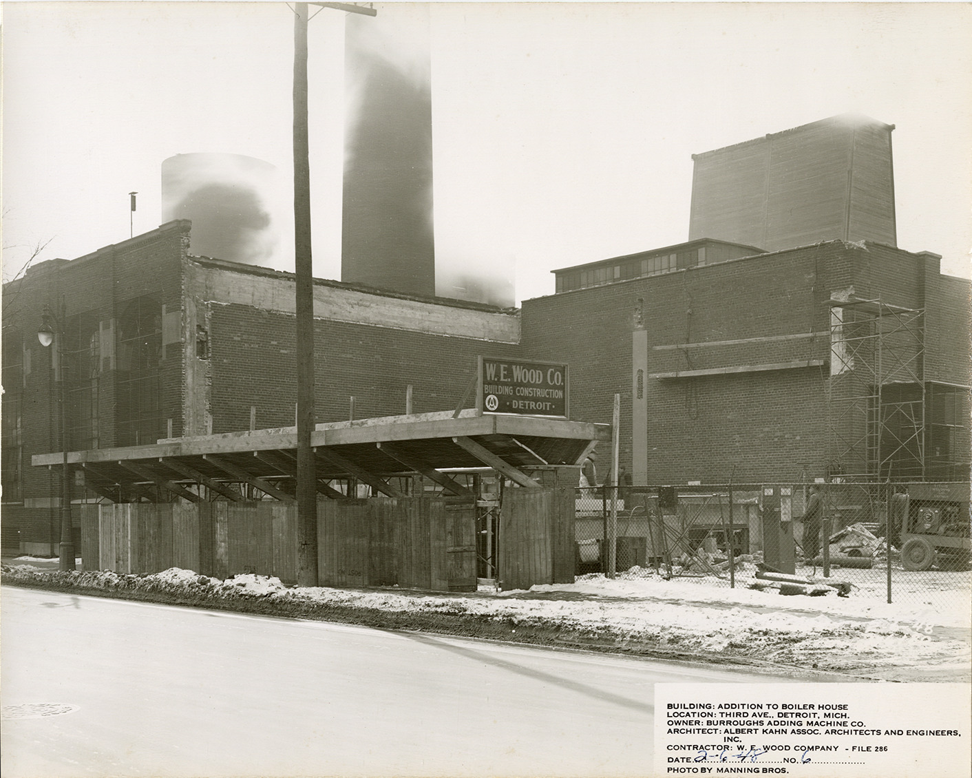 View of workers, equipment and materials on the construction site for the addition to Burroughs Adding Machine Company factory boiler house. "W.E. Wood Co. building construction, Detroit" sign displayed on site. Printed on front: "2-6-48. 176180. Building: Addition to boiler house. Location: Third Ave., Detroit, Mich. Owner: Burroughs Adding Machine Co. Architect: Albert Kahn Assoc. Architects and Engineers, Inc. Contractor: W.E. Wood Company, file 286. Date: 2-6-48. No. 6. Photo by Manning Bros."