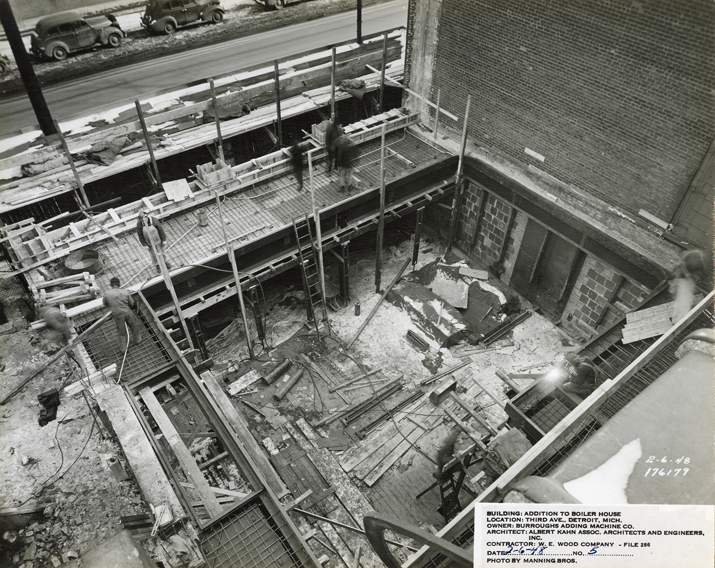 Bird's-eye view of the addition to Burroughs Adding Machine Company factory boiler house during construction, showing interior. Workers stand on rebar. Printed on front: "2-6-48. 176179. Building: Addition to boiler house. Location: Third Ave., Detroit, Mich. Owner: Burroughs Adding Machine Co. Architect: Albert Kahn Assoc. Architects and Engineers, Inc. Contractor: W.E. Wood Company, file 286. Date: 2-6-48. No. 5. Photo by Manning Bros."