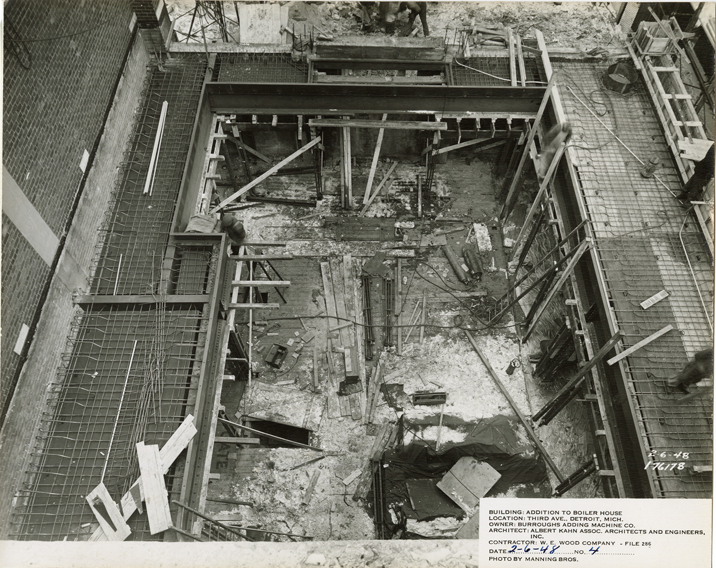 Bird's-eye view of the addition to Burroughs Adding Machine Company factory boiler house during construction, showing interior. Printed on front: "2-6-48. 176178. Building: Addition to boiler house. Location: Third Ave., Detroit, Mich. Owner: Burroughs Adding Machine Co. Architect: Albert Kahn Assoc. Architects and Engineers, Inc. Contractor: W.E. Wood Company, file 286. Date: 2-6-48. No. 4. Photo by Manning Bros."