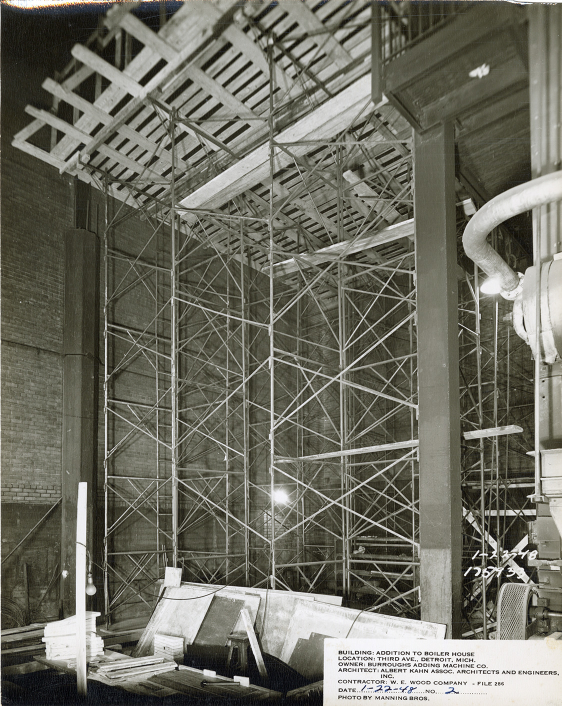 View of the addition to Burroughs Adding Machine Company factory boiler house during construction, showing interior with scaffolding. Construction materials on floor. Printed on front: "1-22-48. 175933. Building: Addition to boiler house. Location: Third Ave., Detroit, Mich. Owner: Burroughs Adding Machine Co. Architect: Albert Kahn Assoc. Architects and Engineers, Inc. Contractor: W.E. Wood Company, file 286. Date: 1-22-48. No. 2. Photo by Manning Bros."