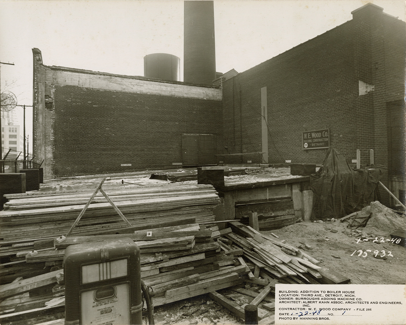 View of the addition to Burroughs Adding Machine Company factory boiler house during construction, showing stacks of lumber in foreground. "W.E. Wood building construction, Detroit" sign on wall in background. Printed on front: "1-22-48. 175932. Building: Addition to boiler house. Location: Third Ave., Detroit, Mich. Owner: Burroughs Adding Machine Co. Architect: Albert Kahn Assoc. Architects and Engineers, Inc. Contractor: W.E. Wood Company, file 286. Date: 1-22-48. No. 1. Photo by Manning Bros."