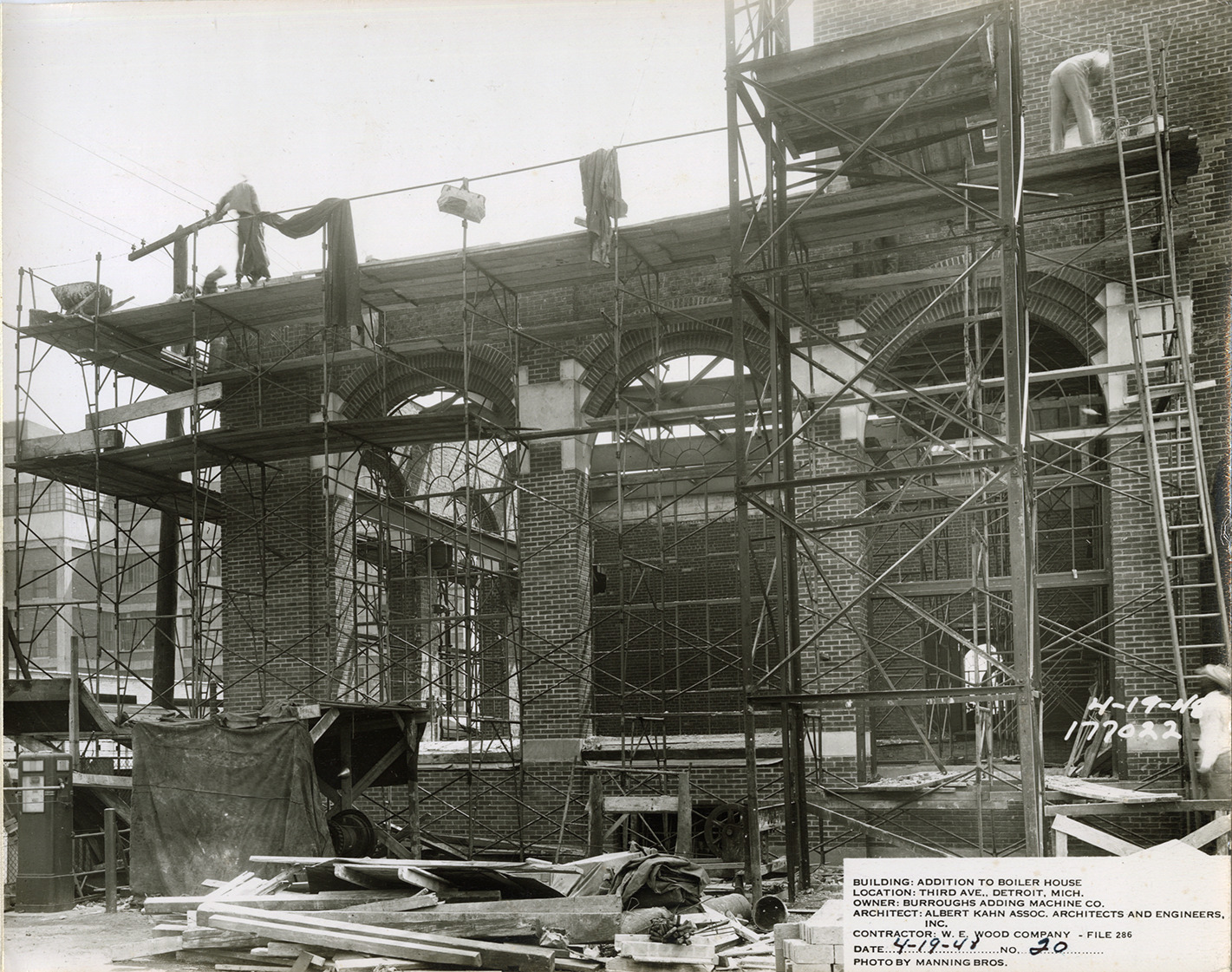 Favorite this☆ Boiler house addition during construction, Burroughs Adding Machine Company factory Description: View of workers constructing the addition to Burroughs Adding Machine Company factory boiler house. Scaffolding surrounds building. Printed on front: "4-19-48. 177022. Building: Addition to boiler house. Location: Third Ave., Detroit, Mich. Owner: Burroughs Adding Machine Co. Architect: Albert Kahn Assoc. Architects and Engineers, Inc. Contractor: W.E. Wood Company, file 286. Date: 4-19-48. No. 20. Photo by Manning Bros." Details Resource ID: bh028566 Creator: Manning Brothers Subject: Scaffolding Construction workers--Michigan--Detroit Power-plants--Michigan--Detroit--Design and construction Buildings--Additions--Michigan--Detroit--Design and construction Burroughs Adding Machine Company Albert Kahn Associates Photographers--Michigan--Detroit Photographic prints Date Issued: 1948-04-19 Format: 1 photographic print mounted on fabric ; 7.5 x 9.5 in. Member of: Burton Historical Collection Filing Location: D/Industries and business houses-Burroughs Adding Machine Co. Rights: Physical rights are retained by DPL. Copyright is retained in accordance with U.S. copyright laws.