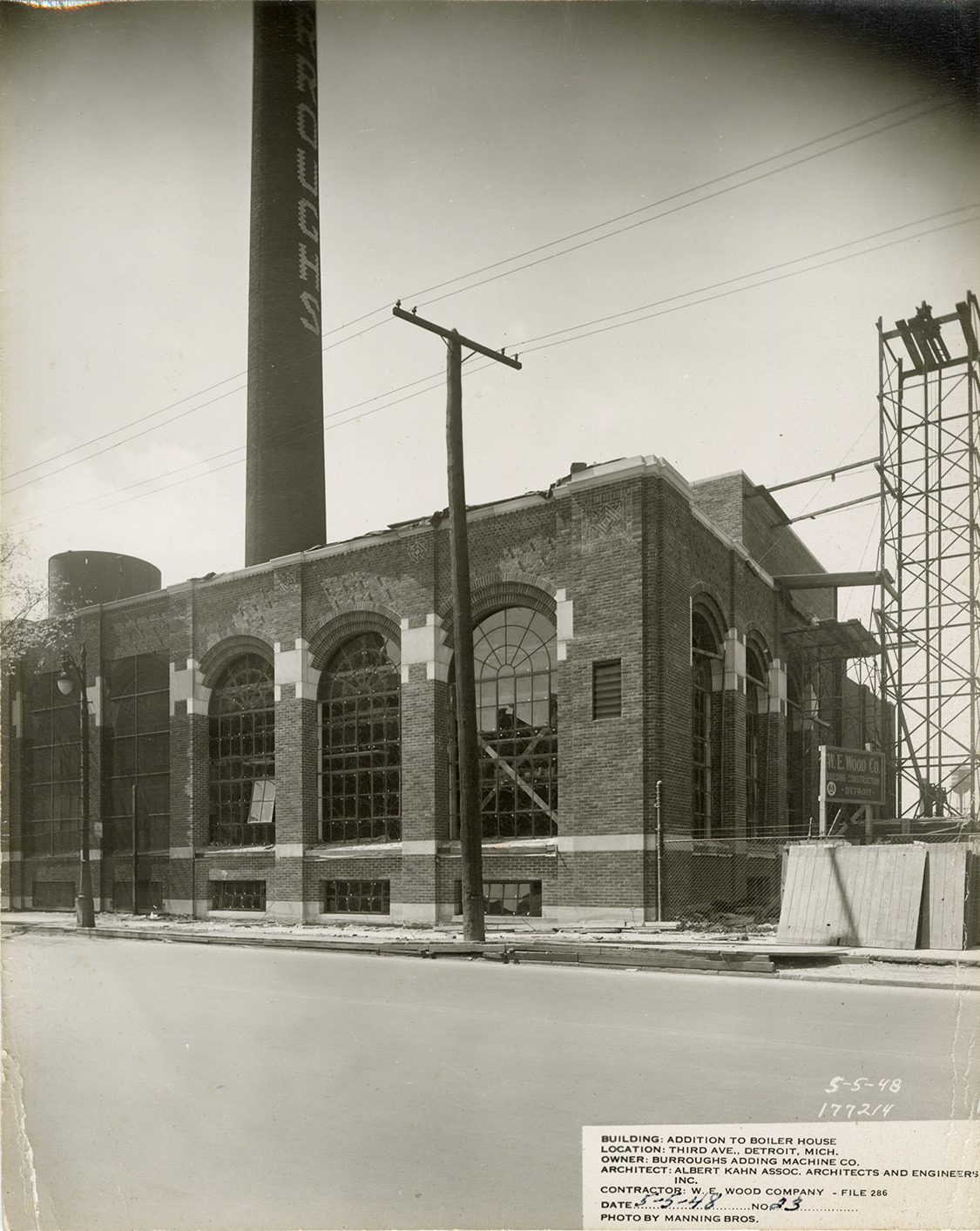 View of the addition to Burroughs Adding Machine Company factory boiler house during construction. Scaffolding and "W.E. Wood building construction, Detroit" sign on right. Printed on front: "5-5-48. 177214. Building: Addition to boiler house. Location: Third Ave., Detroit, Mich. Owner: Burroughs Adding Machine Co. Architect: Albert Kahn Assoc. Architects and Engineers, Inc. Contractor: W.E. Wood Company, file 286. Date: 5-5-48. No. 23. Photo by Manning Bros."