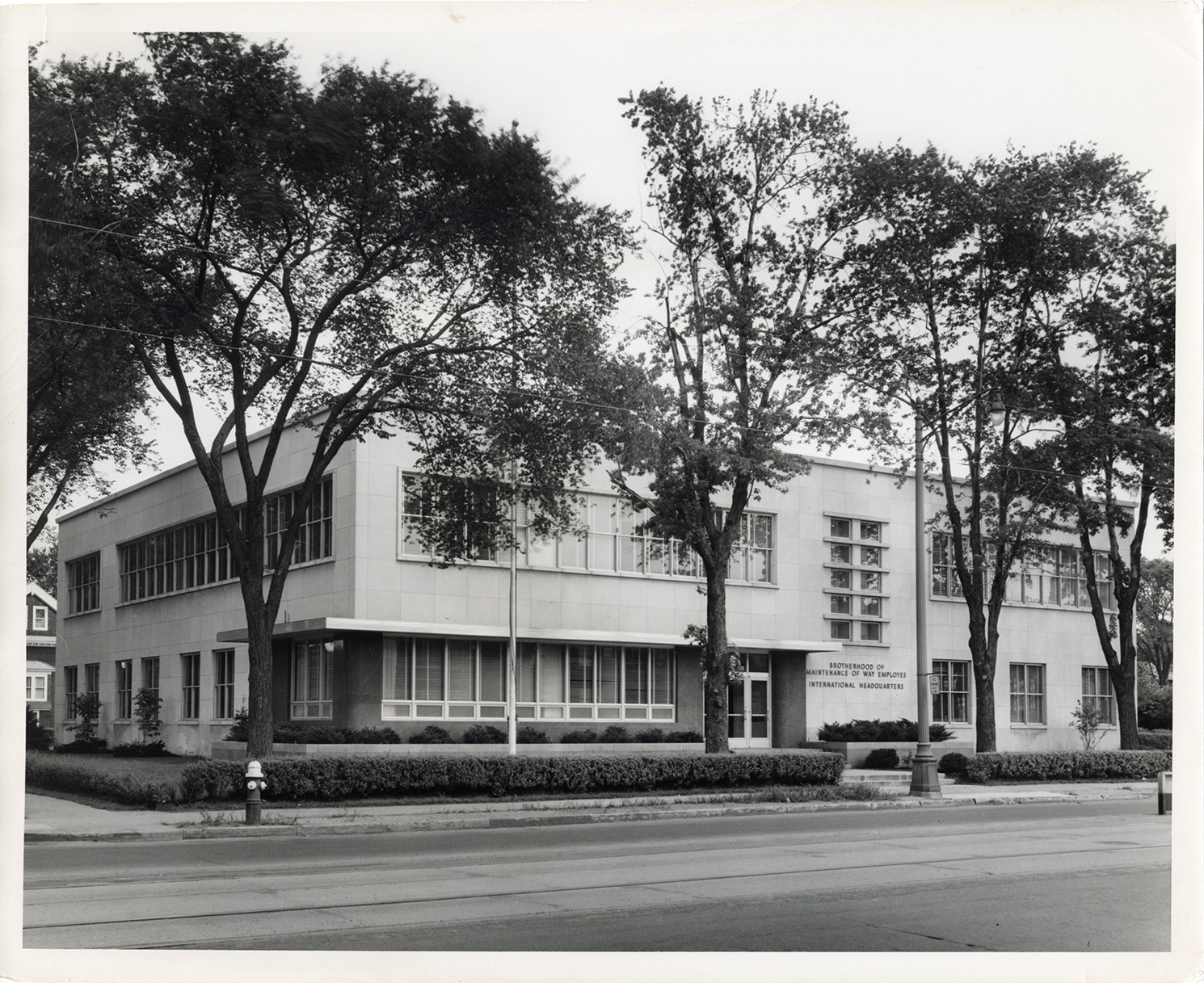 View of the building for the International headquarters, Brotherhood of Maintenance of Way Employes, in Highland Park, Michigan. Label on back: "Brotherhood of Maintenance of Way Employes, 12050 Woodward Avenue, Detroit, Michigan 48203." Stamped on back: "Photo by Phil Olsen."