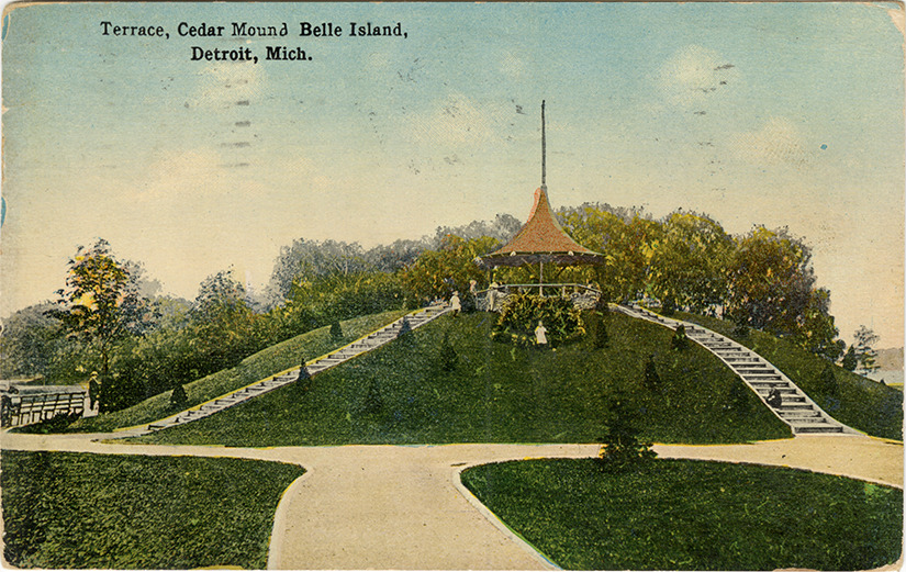 View of the Cedar mound on Belle Isle. Stairs on hill lead to pavilion at the top. Printed on front: "Terrace, cedar mound, Belle Island [sic], Detroit, Mich." Handwritten on back: "Dear friend. June 23, 1915. How are all of you folks. Have often thought of you as we were thinking of going to see you but don't know if you are still living thair [sic] yet. Lewis has a few days to spend and will just try and see how much fun he can have I suppose. Cannot get away till July 16, we have moved to 655 Vermont. Say now write so we will now. Miss Louisa Balow." Card is postmarked June 27, 1915.