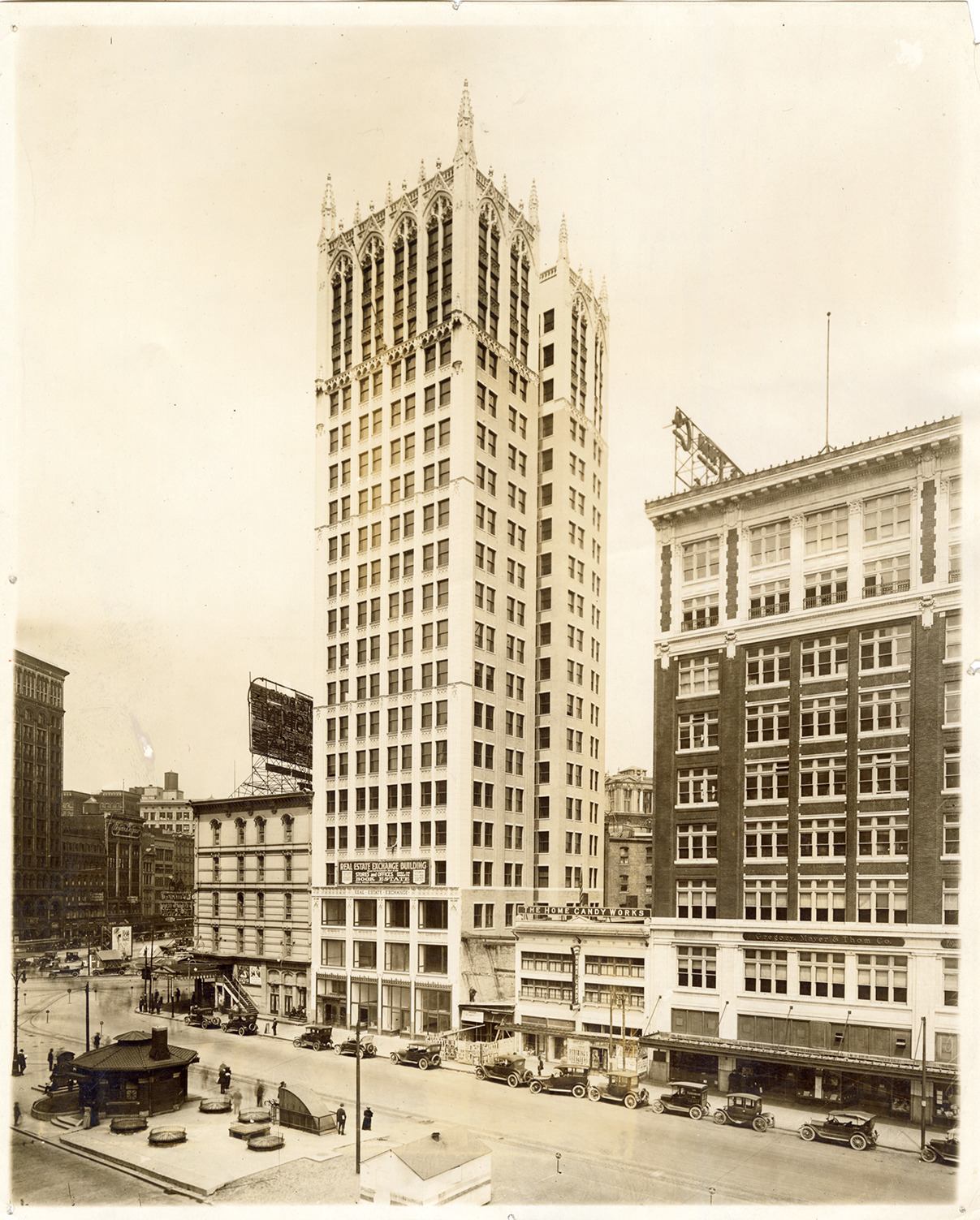 View of Real Estate Exchange building located at Cadillac Square. Also known as the Cadillac Square Building. The Home Candy Works building is adjacent. Handwritten on back: "Real Estate Exchange bldg., north side Cadillac Square. Gregory, Mayer & Thom at the right. Majestic Bldg. at extreme left. 1919."