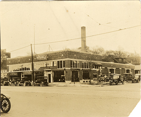 View of the G. & R. Donaldson Motor Sales Ford dealership on Hamilton Avenue at the corner of Highland. Cars parked in street. Handwritten on back: "Hamilton & Highland."