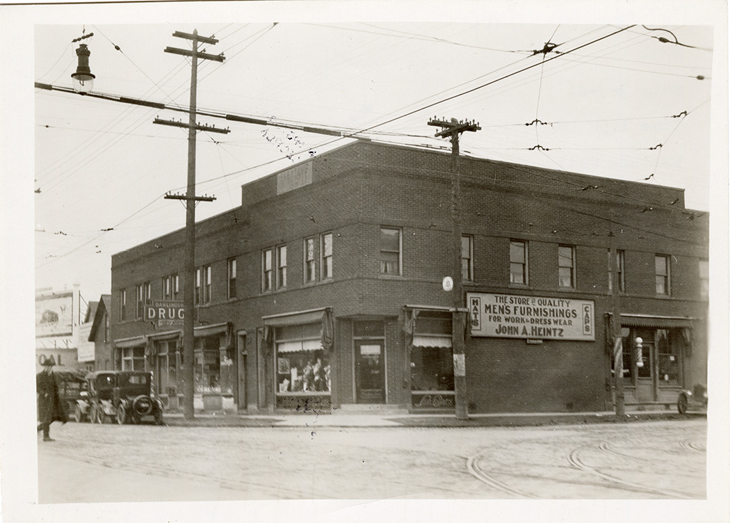 View of Dahlinger drugstore and John A. Heintz men's store at the corner of Harper Ave. and Van Dyke. Sign on building reads: "The store of quality, men's furnishings, hats, caps, for work & dresswear, John A. Heintz." Typed on back: "#202. Date: 3-7-21. Time: 1:52 PM. Weather dull. Direction: looking west. Location: 42' E. of E. Van Dyke curb line on S. Harper curb line. Subject: Showing west corner of Harper & Van Dyke. Detail of streets, obstructions, overhead, etc."
