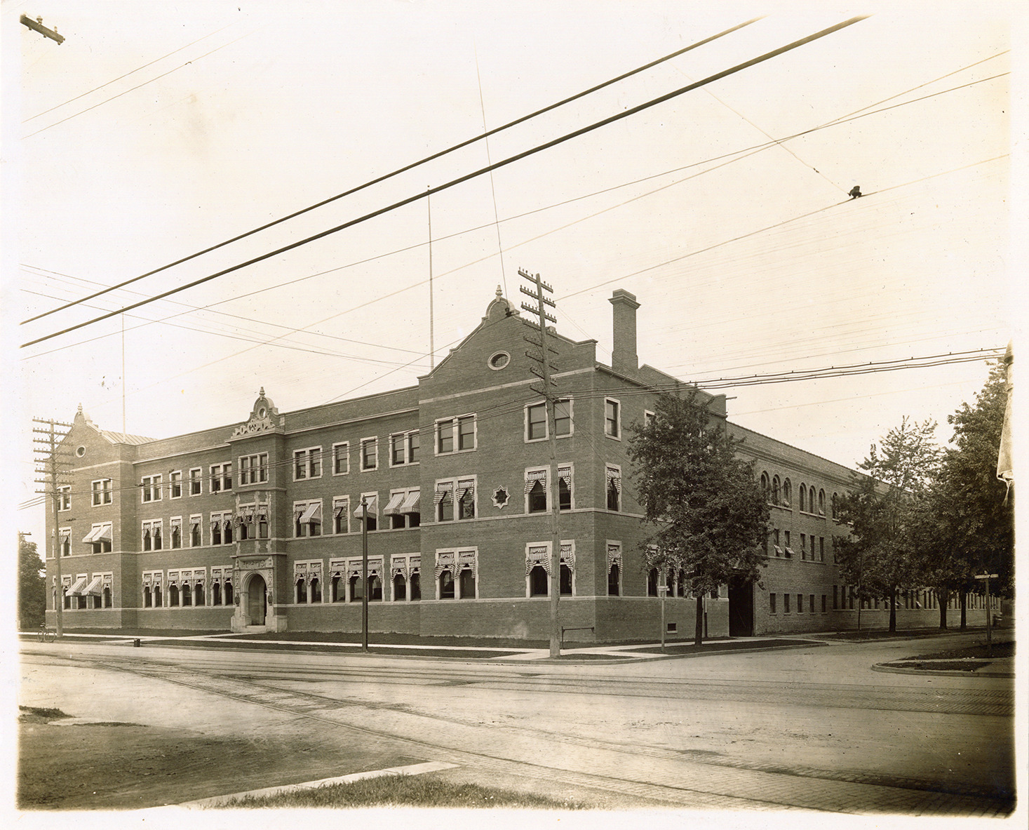 View of Frederick Stearns & Co. building, located on Jefferson and Bellevue. Handwritten on back: "Stearns Bldg."