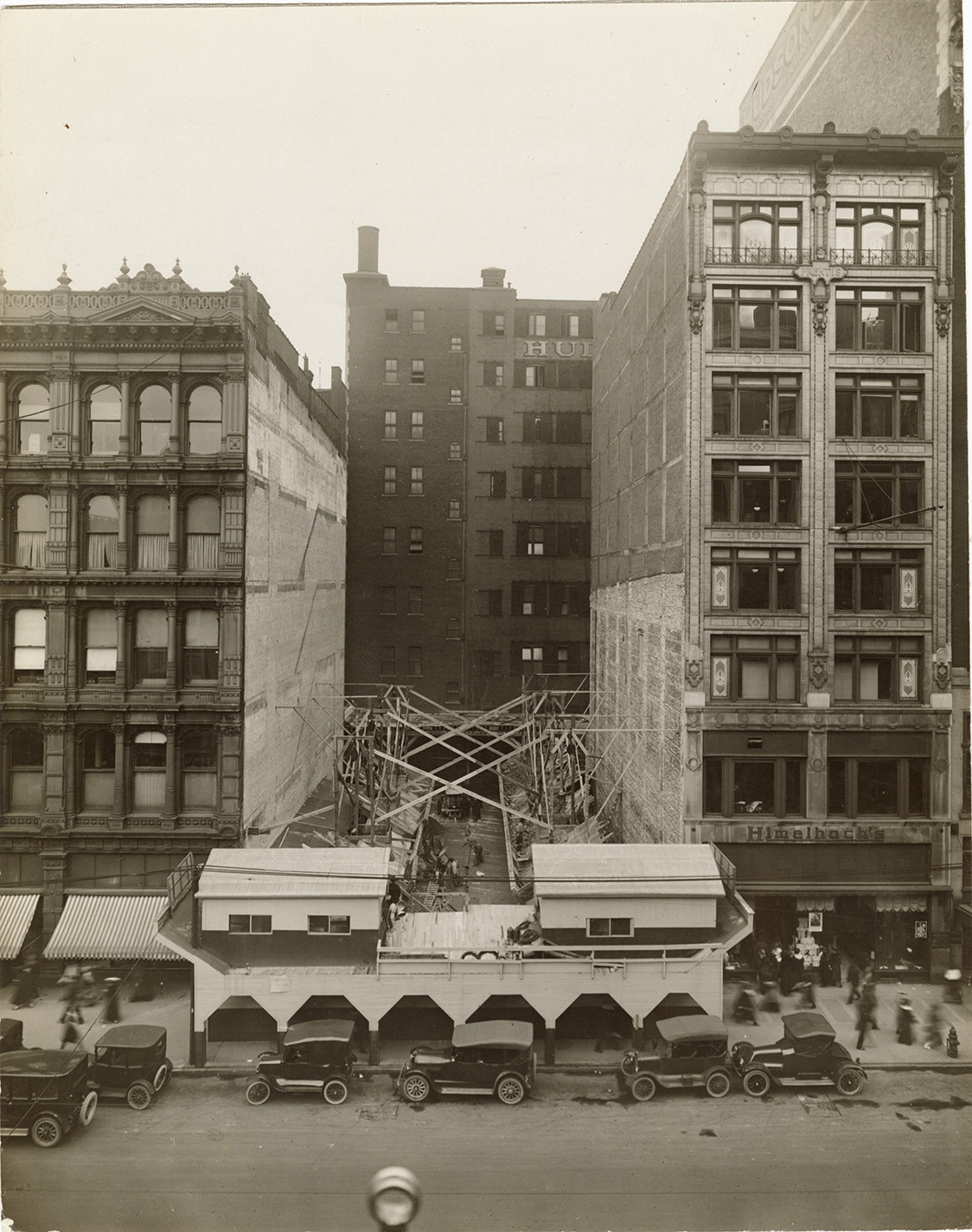 Favorite this☆ J.L. Hudson Company addition during construction Description: View of the J.L. Hudson Company addition on Woodward Avenue during construction. Prentis Building on right, with Himelhoch's sign on ground level. Cars parked in street. Details Resource ID: bh028648 Subject: J.L. Hudson Company Buildings--Additions--Michigan--Detroit--Design and construction Department stores--Michigan--Detroit Photographic prints Date Issued: 1914 Format: 1 photographic print mounted on fabric ; 9.5 x 7.5 in. Member of: Burton Historical Collection Filing Location: D/Industries and business houses-Hudson (J.L.) Rights: Physical rights are retained by DPL. Copyright is retained in accordance with U.S. copyright laws.