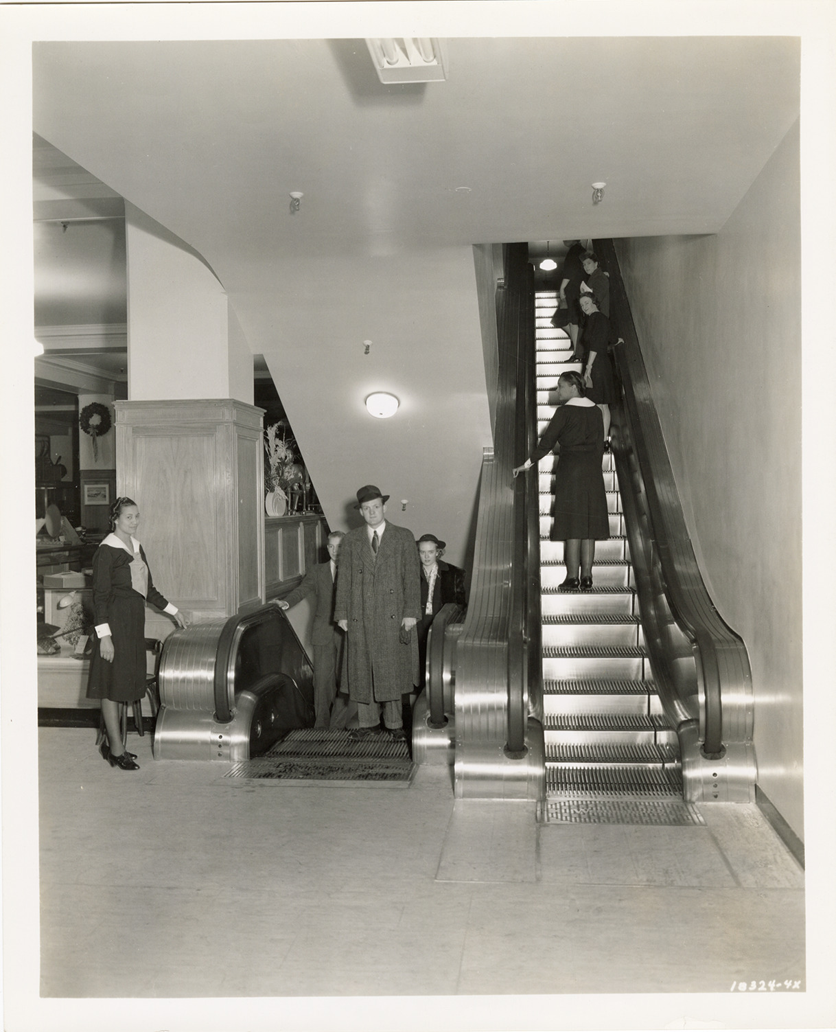 View of customers riding on an escalator at the J.L. Hudson Company department store. Hostess stands next to escalator exit; another hostess rides escalator to upper floor.