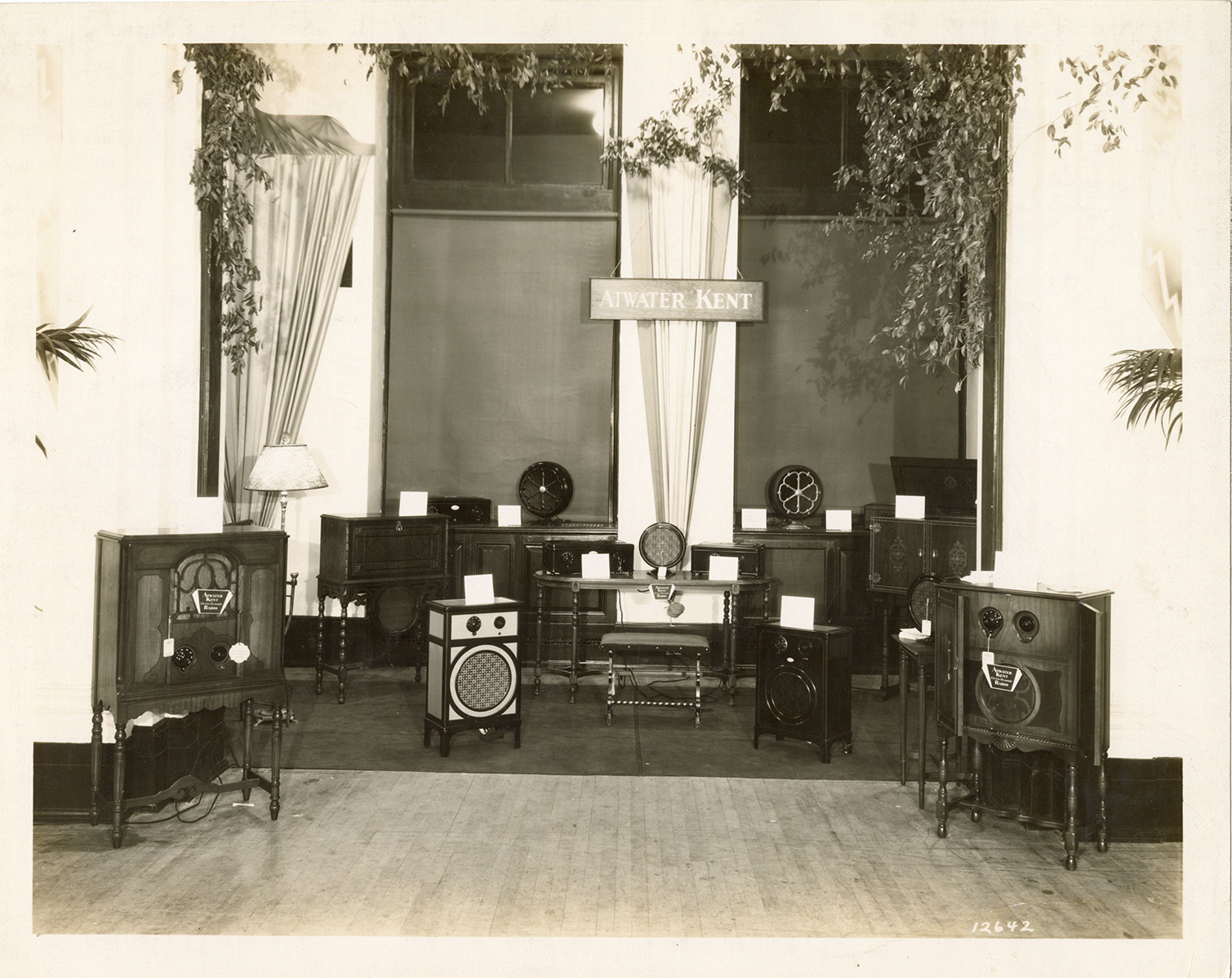 View of a display of Atwater Kent radios at the J.L. Hudson Company department store. Atwater Kent sign in background.