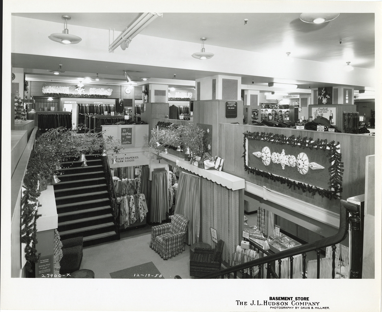 View of the Basement Store at the J.L. Hudson Company department store, showing stairway, fabrics, draperies and Christmas decorations. Men's clothing department in background. Printed on front: "Basement store, the J.L. Hudson Company. Photography by Davis B. Hillmer. 12-19-58."