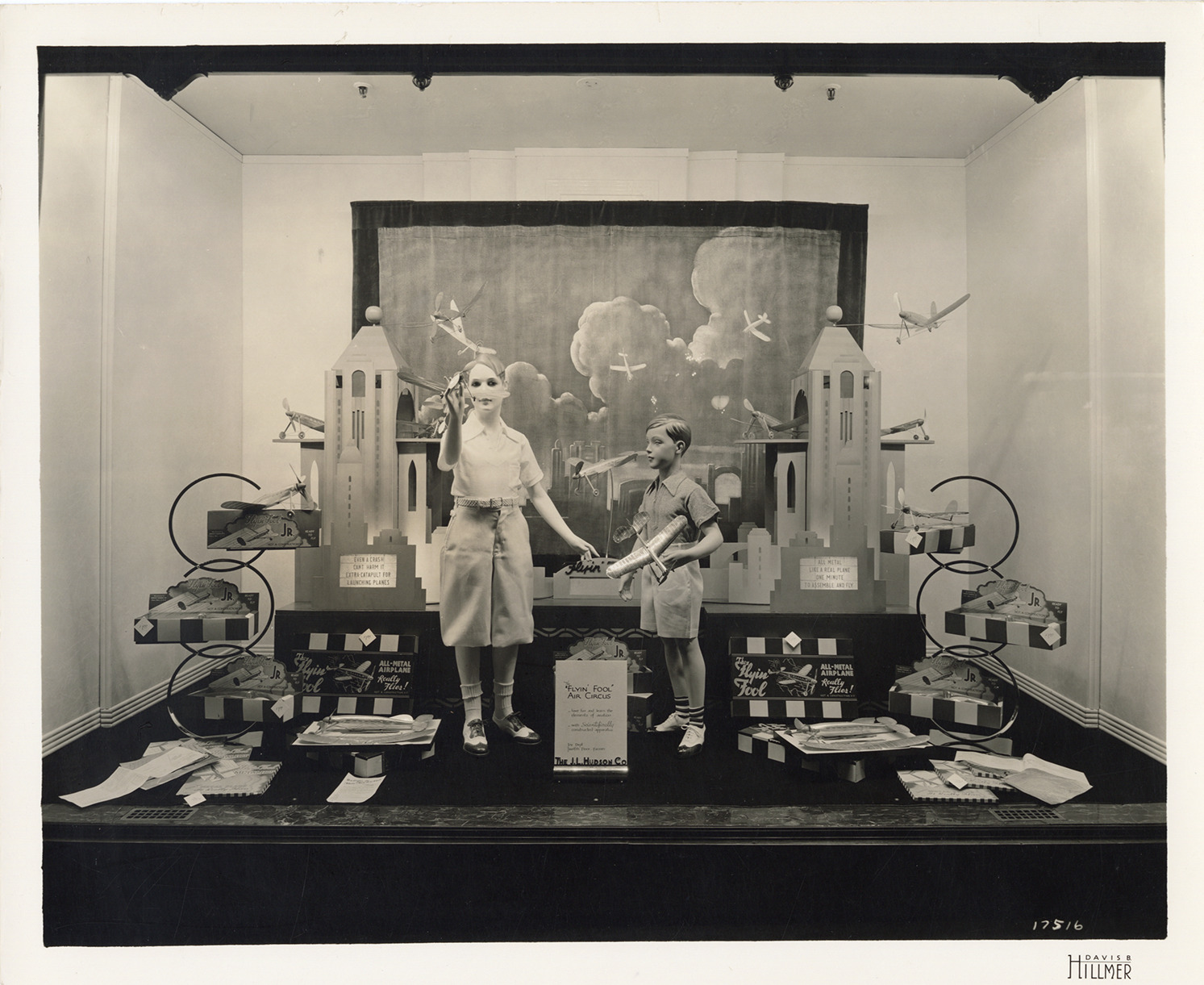 View of a display window at the J.L. Hudson Company department store featuring model airplanes. Two mannequins of boys are posing with model airplanes and replicas of buildings. Artwork of airplanes in clouds displayed in background. Sign in foreground reads: "Flyin' Fool Air Circus. Have fun and learn the elements of aviation with scientifically constructed apparatus. Toy Dept. 12th floor, Farmer." Printed on front: "Davis B. Hillmer."