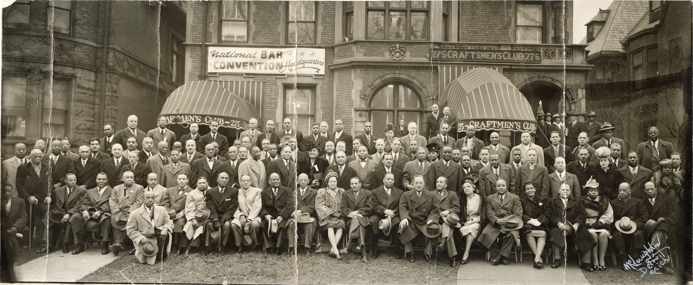 View of lawyers posing in front of the National Bar Association Convention headquarters at the Craftsmen's Club building for the 1952 National Bar Association Convention in Detroit. Signs on brick building read: "National Bar Convention headquarters" and "275 Craftsmen's Club." Handwritten on front: "McLaughlin, Detroit, Mich." Handwritten on back: "1952, National Bar Assn., Detroit, Brush & Erskine St."