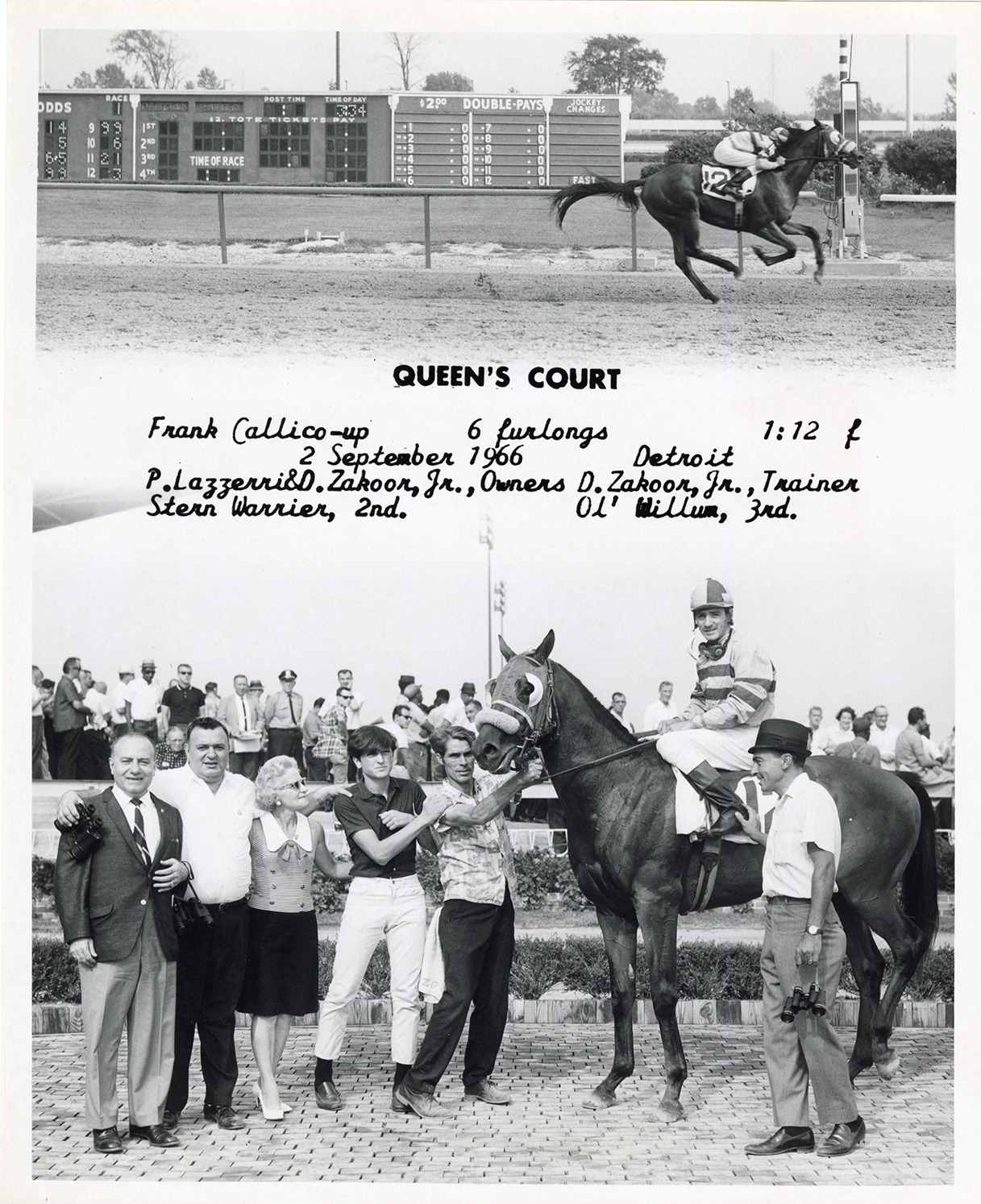 View of jockey and several men and a woman posing with racehorse Queen's Court at the Detroit Race Course. Includes view of photo finish. Printed on front: "Queen's Court. Frank Callico-up. 6 furlongs, 1:12 f. 2 September 1966, Detroit. P. Lazzerri & D. Zakoor, Jr., owners. D. Zakoor, Jr., trainer. Stern Warrier, 2nd. Ol' Willum, 3rd."