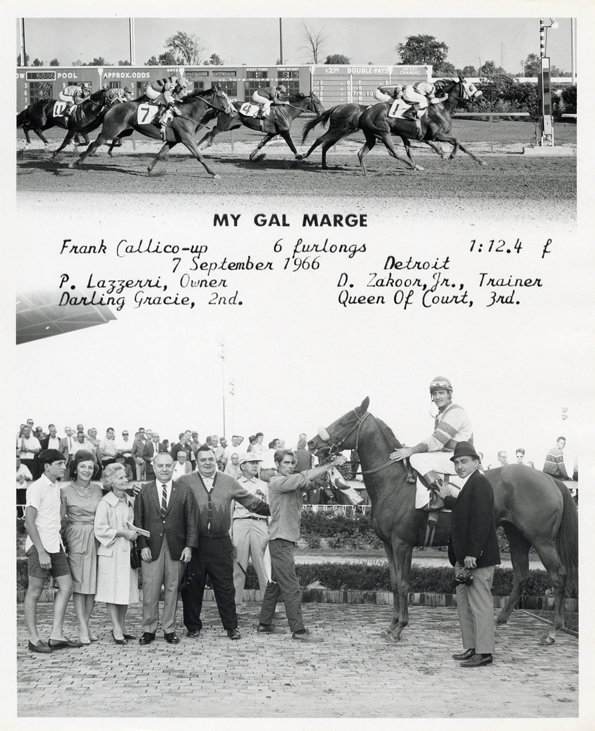 View of jockey and several men and women posing with racehorse My Gal Marge at the Detroit Race Course. Includes view of photo finish. Printed on front: "My Gal Marge. Frank Callico-up. 6 furlongs, 1:12.4 f. 7 September 1966. P. Lazzerri, owner. D. Zakoor, Jr., trainer. Darling Gracie, 2nd. Queen of Court, 3rd."