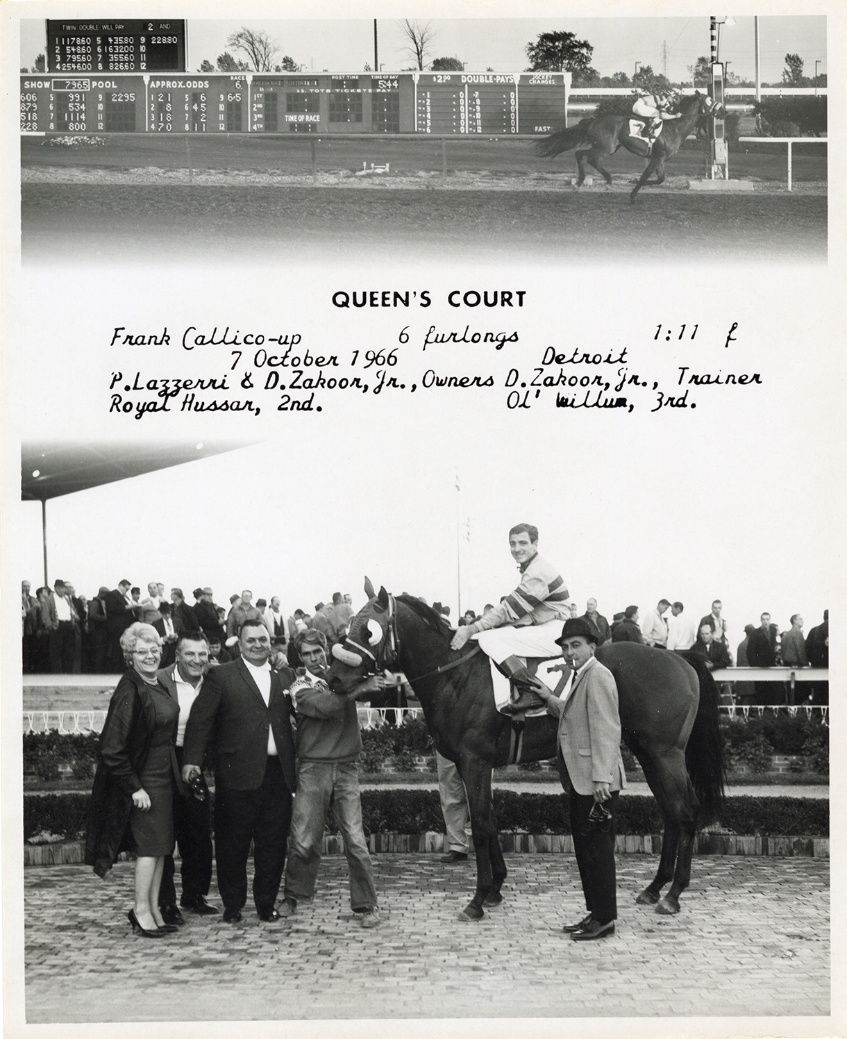 View of jockey and several men and a woman posing with racehorse Queen's Court at the Detroit Race Course. Includes view of photo finish. Printed on front: "Queen's Court. Frank Callico-up. 6 furlongs, 1:11 f. 7 October 1966, Detroit. P. Lazzerri & D. Zakoor, Jr., owners. D. Zakoor, Jr., trainer. Royal Hussar, 2nd. Ol' Willum, 3rd."
