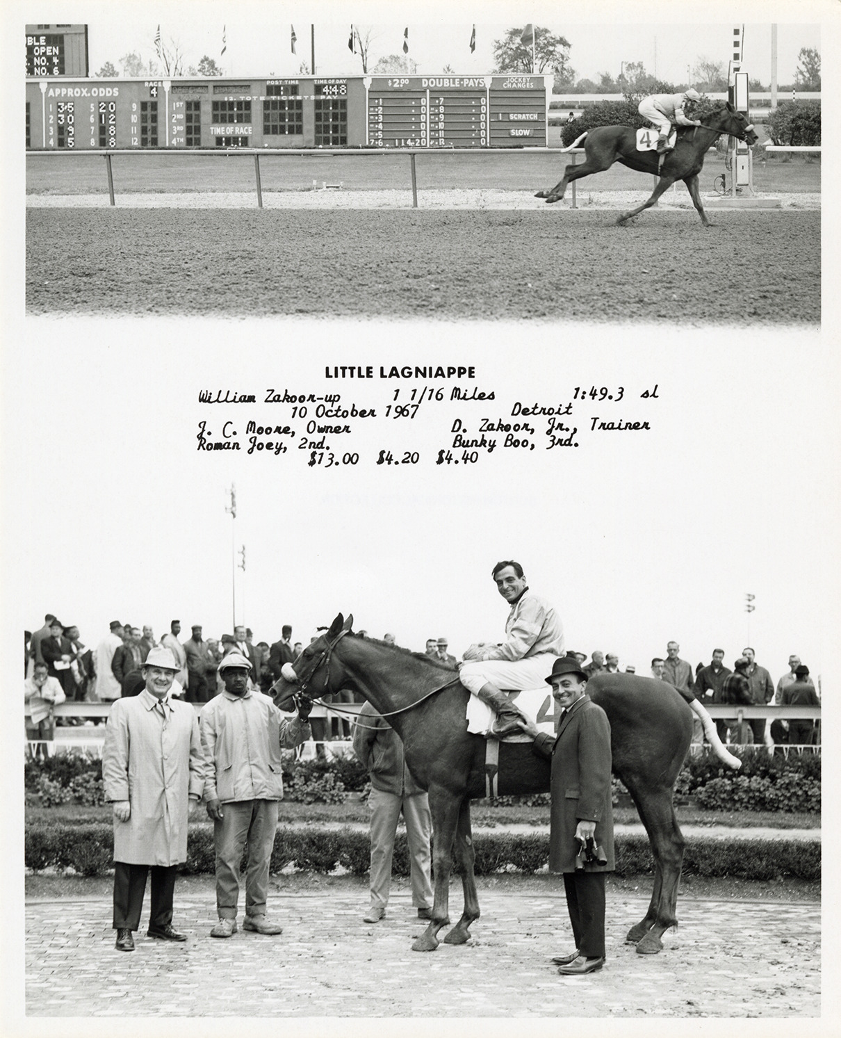 View of jockey and several men posing with racehorse Little Lagniappe at the Detroit Race Course. Includes view of photo finish. Printed on front: "Little Lagniappe. William Zakoor-up. 1-1/16 miles. 1:49.3 sl. 10 October 1967, Detroit. J.C. Moore, owner. D. Zakoor, Jr., trainer. Roman Joey, 2nd. Bunky Boo, 3rd. $13.00, $4.20, $4.40."