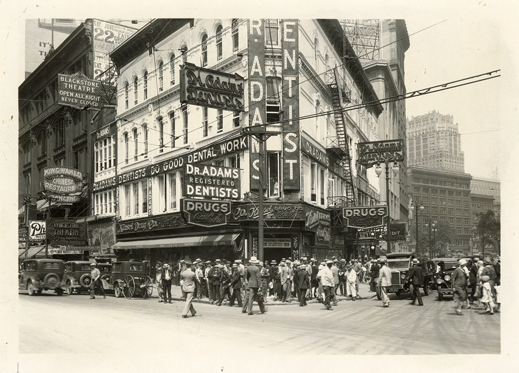 Favorite this☆ Kinsel Drug Co. Description: View of pedestrians walking in front of the Kinsel Drug Co. drugstore on the northwest corner of Michigan Ave. and Griswold. Signs on buildings include Dr. Adams, registered dentists, Blackstone Theatre, and King Wahlo Chinese restaurant. Details Resource ID: bh028755 Subject: Drugstores--Michigan--Detroit Dentists--Michigan--Detroit Theaters--Michigan--Detroit Chinese restaurants--Michigan--Detroit Photographic prints Format: 1 photographic print ; 5 x 7 in. Member of: Burton Historical Collection Filing Location: D/Industries and business houses-Kinsel Drug Co. Rights: Physical rights are retained by DPL. Copyright is retained in accordance with U.S. copyright laws.