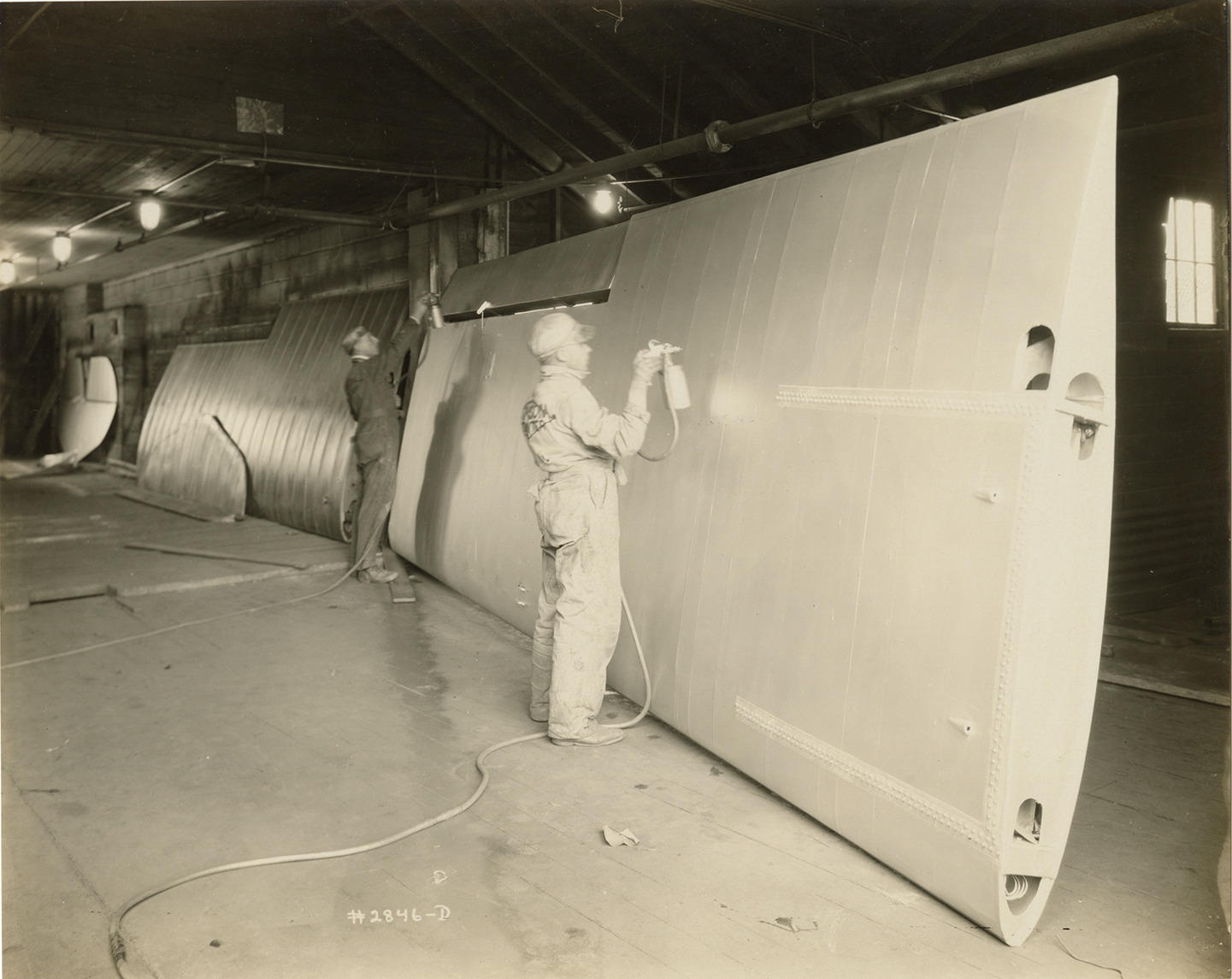 Favorite this☆ Workers spray painting airplane wings, Stinson Aircraft Corporation Description: View of workers spray painting airplane wings at the Stinson Aircraft Corp. factory. Stamped on back: "The L.L. Ball Studio, better photographs. Plymouth, Michigan." Details Resource ID: bh028781 Creator: L.L. Ball Studio Subject: Airplanes--Wings--Design and construction Spray painting Airplanes--Michigan--Detroit--Design and construction Factories--Michigan--Detroit Stinson Aircraft Corporation Aircraft industry--Michigan--Detroit Aircraft industry--Employees Photographers--Michigan--Plymouth Photographic prints Date Issued: Unknown year Format: 1 photographic print ; 7.5 x 9.5 in. Member of: Burton Historical Collection Filing Location: D/Industries and business houses-Stinson Aircraft Corp. Rights: Physical rights are retained by DPL. Copyright is retained in accordance with U.S. copyright laws.