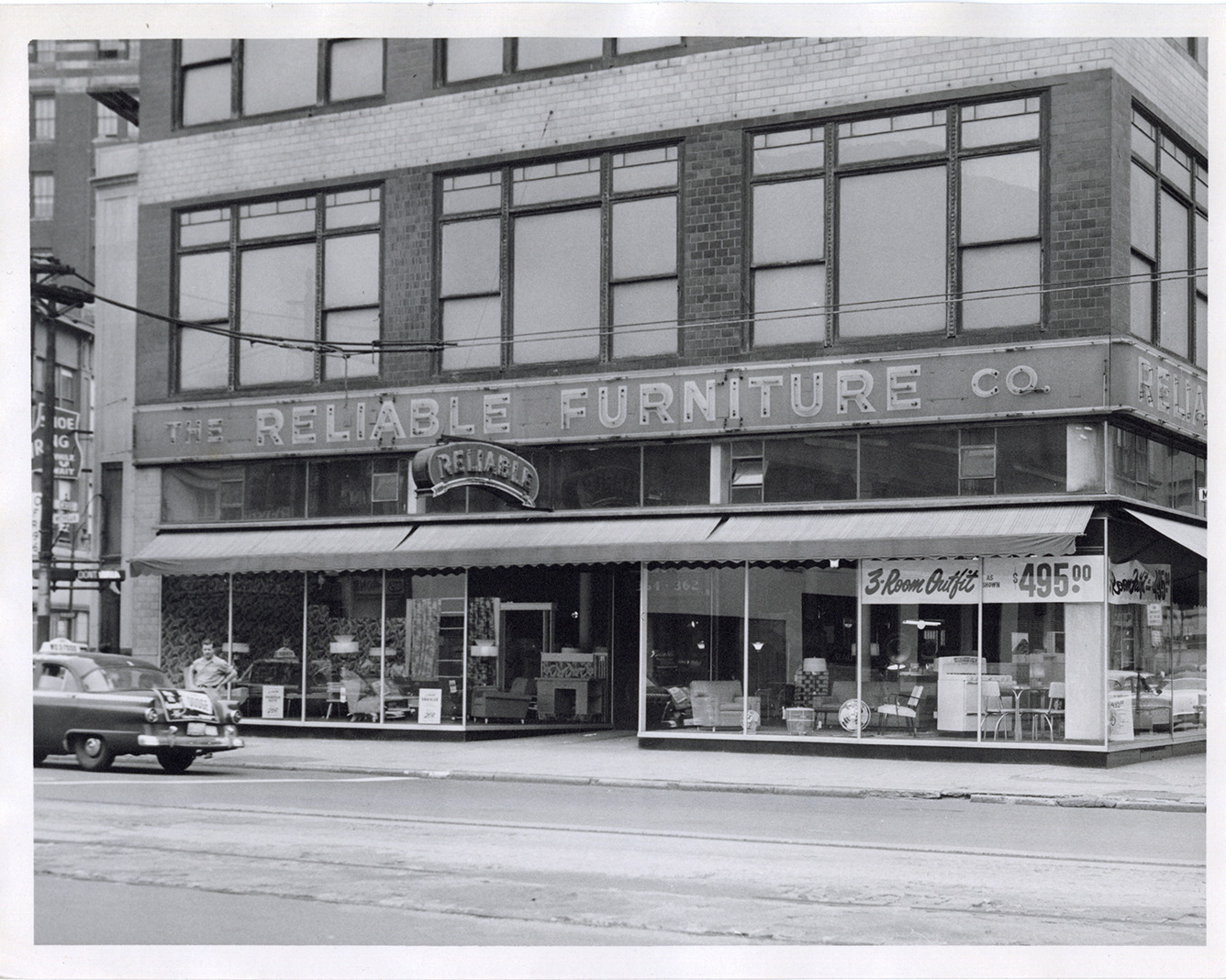Favorite this☆ Reliable Furniture Company Description: View of the Reliable Furniture Co. Furniture and appliances displayed in windows. Neon sign on building; "3-room outfit as shown $495.00" sign in window. Stamped on back: "Free Press photo, Jul 5, 1956." Details Resource ID: bh028792 Creator: Detroit Free Press Subject: Furniture industry and trade--Michigan--Detroit Neon signs--Michigan--Detroit Photographic prints Format: 1 photographic print ; 7 x 9 in. Member of: Burton Historical Collection Filing Location: D/Industries and business houses-Reliable Furniture Rights: Physical rights are retained by DPL. Copyright is retained in accordance with U.S. copyright laws.