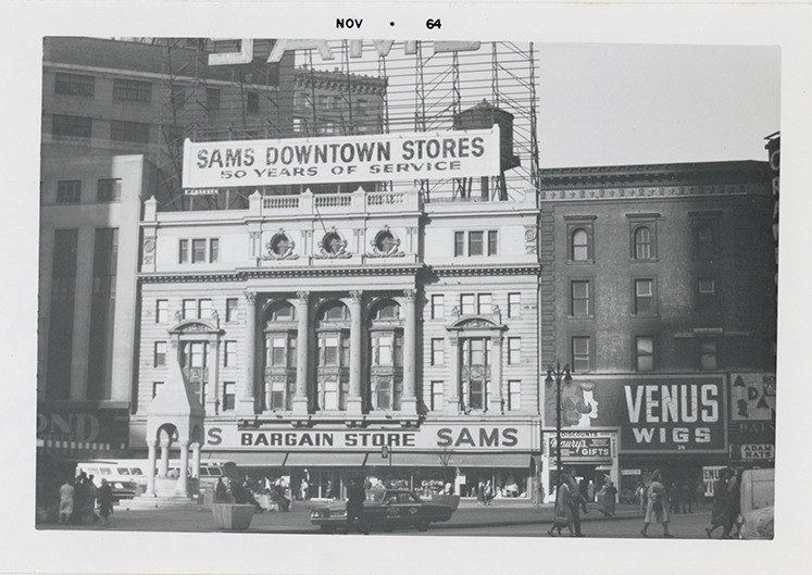 Favorite this☆ Sam's Bargain Store Description: View of Sam's Bargain Store. Sign on building reads: "Sams Downtown Stores, 50 years of service." Printed on front: "Nov 1964." Handwritten on back: "Campus Martius, Oct. 1964. Effie M. Morse." Details Resource ID: bh028800 Creator: Morse, Effie M. Subject: Discount houses (Retail trade)--Michigan--Detroit Stores, Retail--Michigan--Detroit Photographic prints Date Issued: 1964-10 Format: 1 photographic print ; 3 x 4 in. Member of: Burton Historical Collection Filing Location: D/Industries and business houses-Sam's Rights: Physical rights are retained by DPL. Copyright is retained in accordance with U.S. copyright laws.