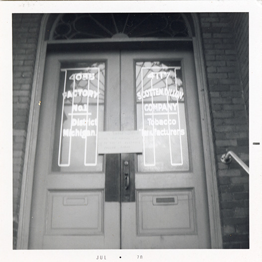 Favorite this☆ Entrance, Scotten Dillon Company Description: Close-up view of the doors of the Scotten Dillon Company building. Painted on glass on left: "4085 Factory no. 1. District, Michigan." Painted on glass on right: "4117 Scotten Dillon Company, tobacco manufacturers." Printed on front: "Jul 70." Details Resource ID: bh028807 Subject: Doors--Michigan--Detroit Tobacco industry--Michigan--Detroit Commercial buildings--Michigan--Detroit Photographic prints Date Issued: 1970-07 Format: 1 photographic print ; 3.5 x 3.5 in. Member of: Burton Historical Collection Filing Location: D/Industries and business houses-Scotten Dillon Rights: Physical rights are retained by DPL. Copyright is retained in accordance with U.S. copyright laws.