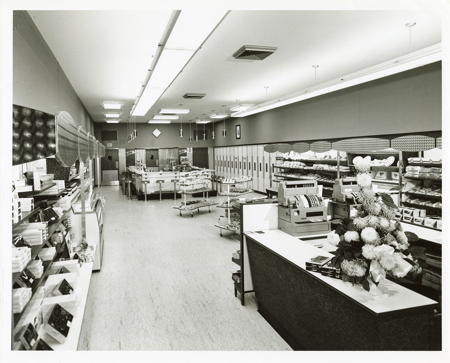 View of the interior of a Sanders confectionery. Candy and baked goods are displayed on shelves. Cash registers and floral arrangement of chrysanthemums in foreground. Soda fountain counter in background. Stamped on back: "Ange Baune photography. 5533 Woodward Ave., Detroit 2, Mich. Te. 2-2011."