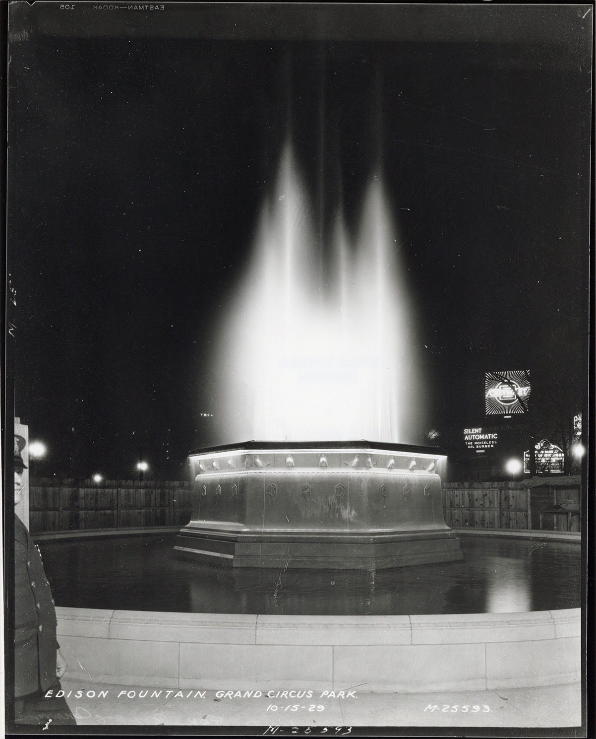 Nighttime view of illuminated Edison Fountain, located on West Grand Circus Park, near Adams Avenue. Fountain was erected in honor of Thomas A. Edison, commemorating the 50th anniversary of his electric incandescent lamp. Policeman is partially visible on left. Printed on front: "Edison Fountain, Grand Circus Park, 10-15-29."